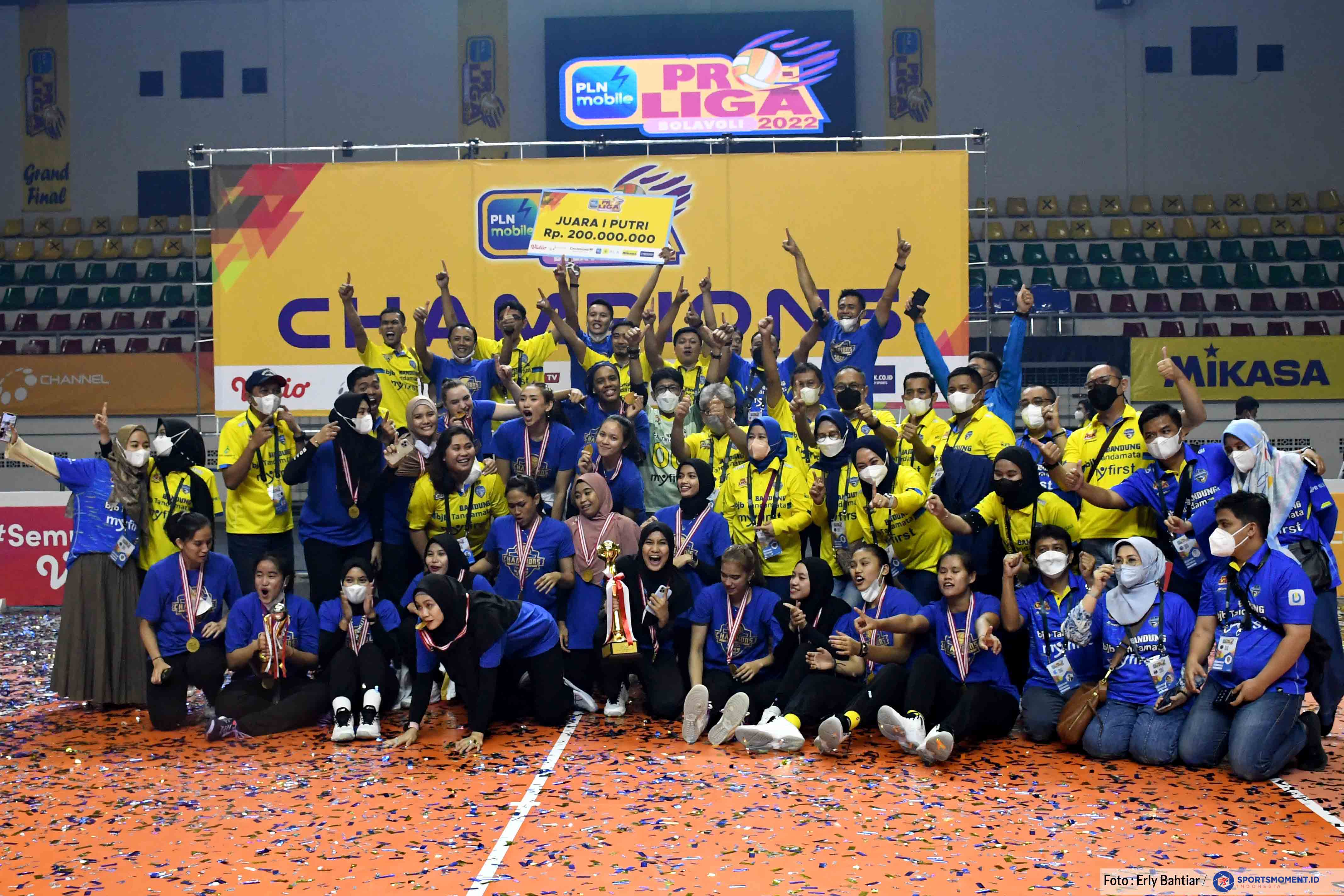 Tim putri Bandung BJB Tandamata menjadi juara PLN Mobile Proliga 2022 usai mengalahkan Gresik Petrokimia Pupuk Indonesia (GPP) di GOR Padepokan Voli Jenderal Polisi Kunarto, Sentul, Bogor, Sabtu (26/3/2022), Bandung BJB Tandamata menang dengan skor 3-1 (25-17, 25-19, 22-25, 25-18) atas GPP. (Foto : Erly Bahtiar/sportsmoment.id),,