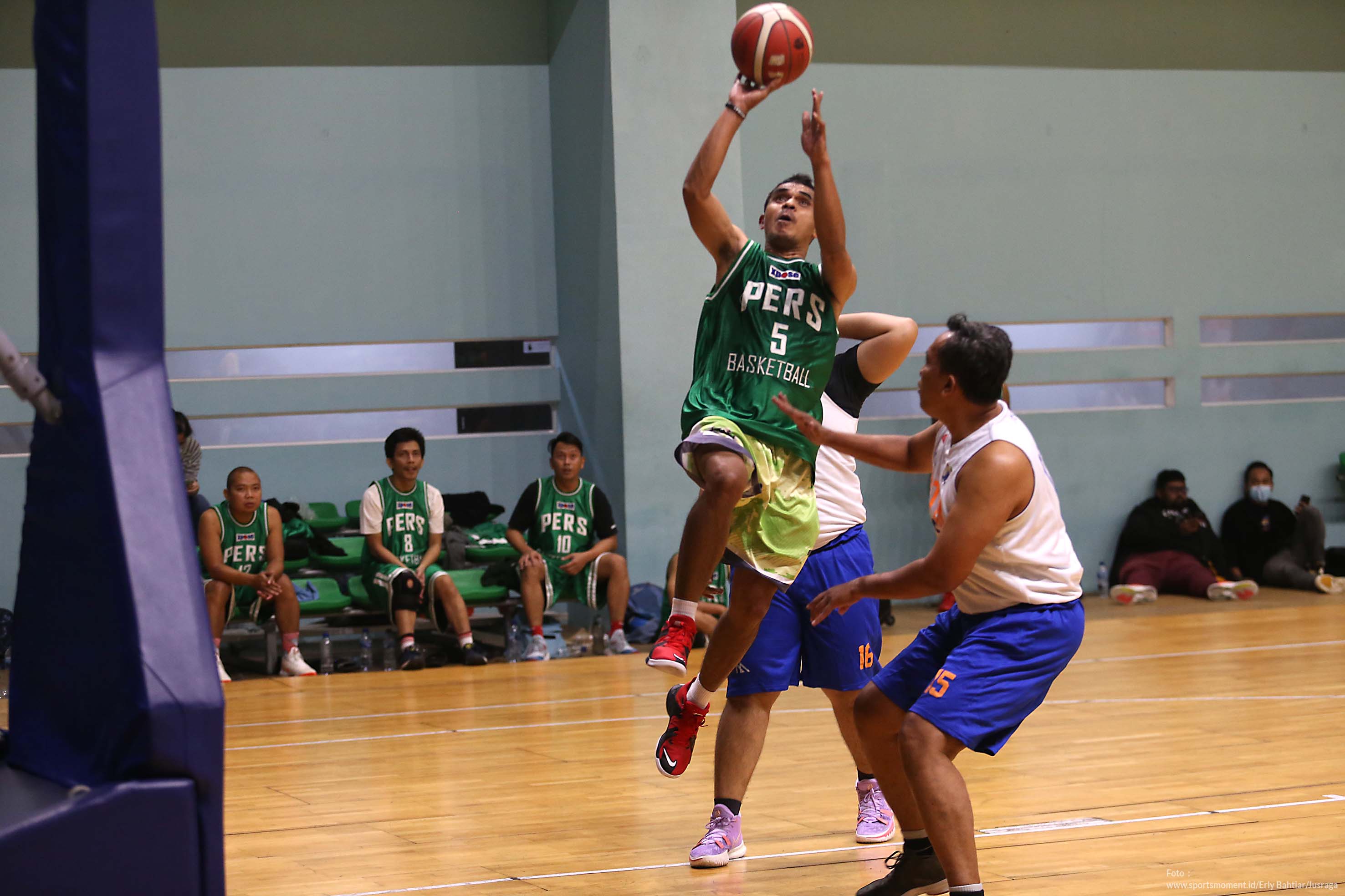 Eky Reuwpassa jurnalis TVRI yang bergabung dalam JUSRAGA (Jurnalis Peduli dan Suka Olahraga) beraksi di pagelaran Dewa United Surabaya Fun Games bersama awak media di GBK Arena, Jumat (17/12) sore. Acara main basket bareng ini menjadi momen silaturahmi jelang bergulurnya IBL 2022 yang direncanakan mulai pada 15 Januari di Hall Basket Senayan, Jakarta. Photo : Erly Bahtiar