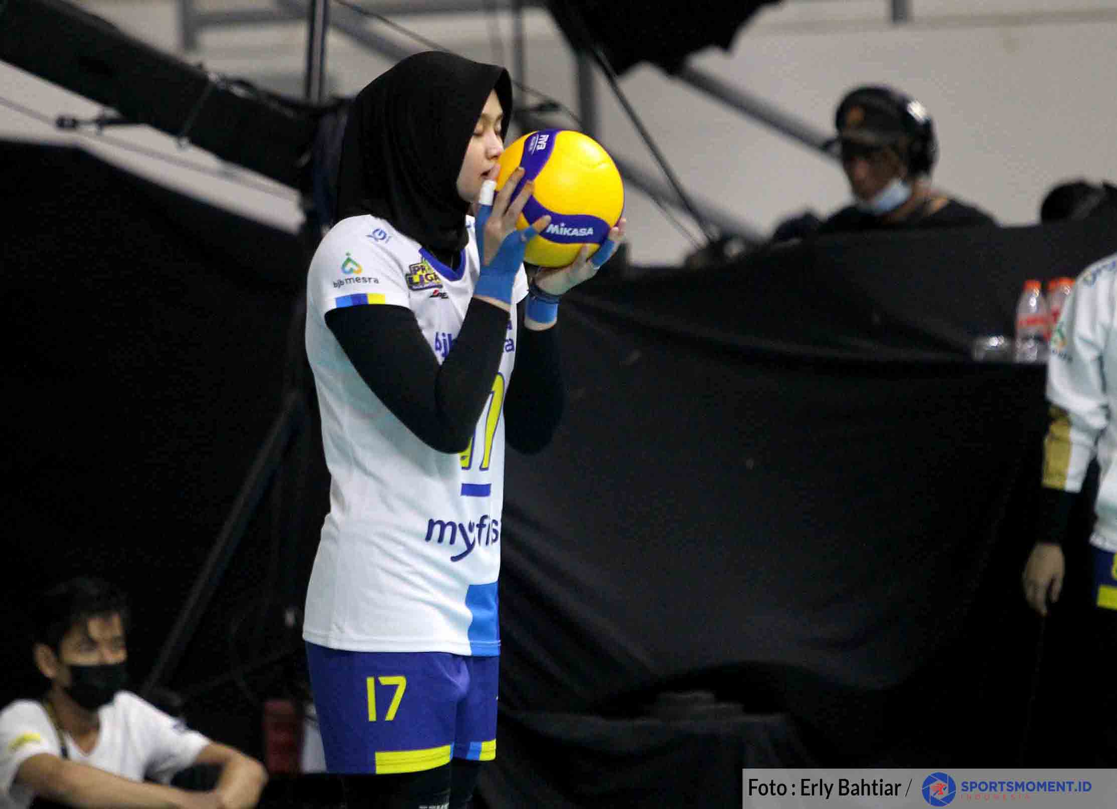 Nety Dyah Puspitarani (17) pemain bola voli putri Bandung BJB Tandamata bersiap melakukan servis. Tim putri Bandung BJB Tandamata menjadi juara PLN Mobile Proliga 2022 usai mengalahkan Gresik Petrokimia Pupuk Indonesia (GPP) di GOR Padepokan Voli Jenderal Polisi Kunarto, Sentul, Bogor, Sabtu (26/3/2022). Bandung BJB Tandamata menang dengan skor 3-1 (25-17, 25-19, 22-25, 25-18) atas GPP. (Foto : Erly Bahtiar/sportsmoment.id)