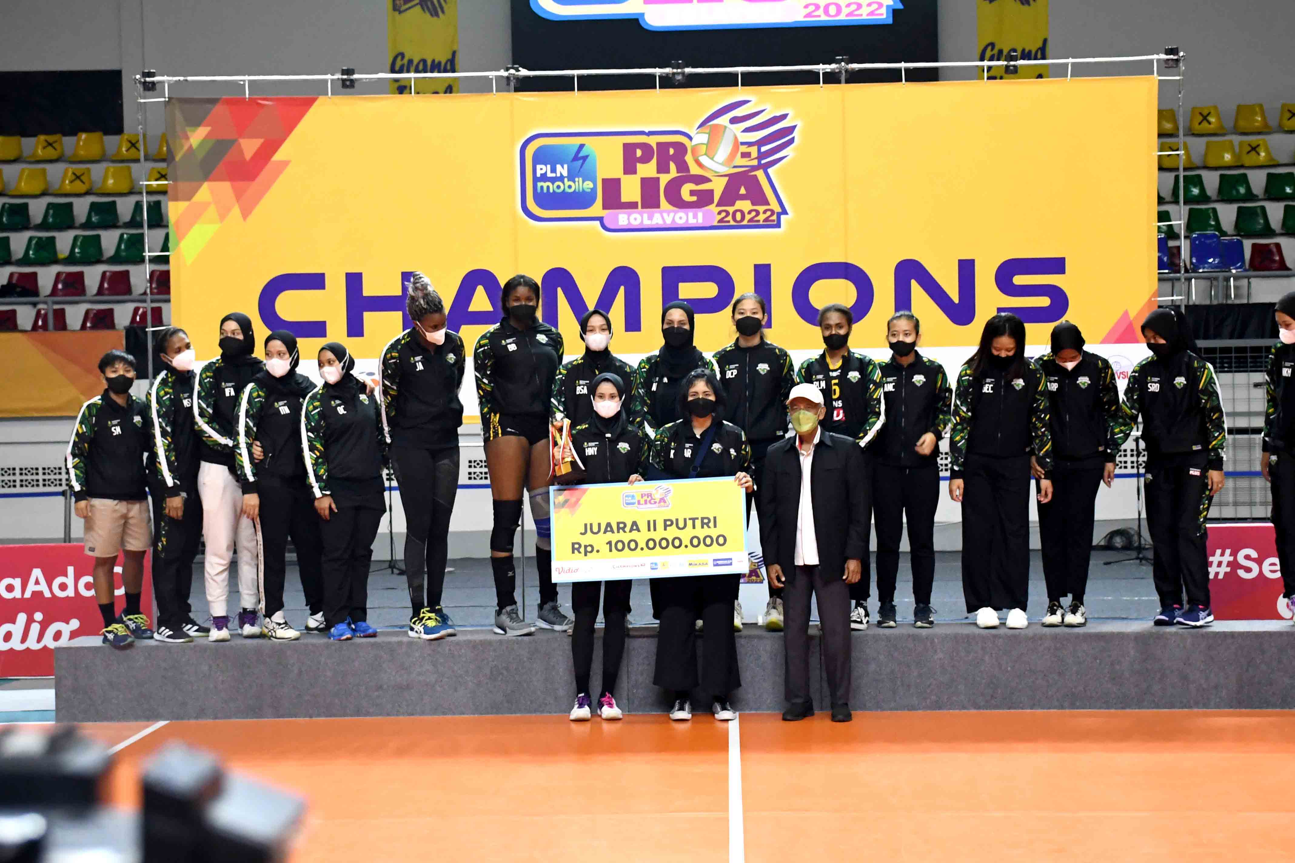 Peringkat Kedua Gresik Petrokimia Pupuk Indonesia Proliga 2022 menerima hadiah di GOR Padepokan Voli Jenderal Polisi Kunarto, Sentul, Bogor, Sabtu (26/3/2022), Bank bjb Tandamata menang dengan skor 3-1 (25-17, 25-19, 22-25, 25-18) atas GPP. (Foto : Erly Bahtiar/sportsmoment.id).