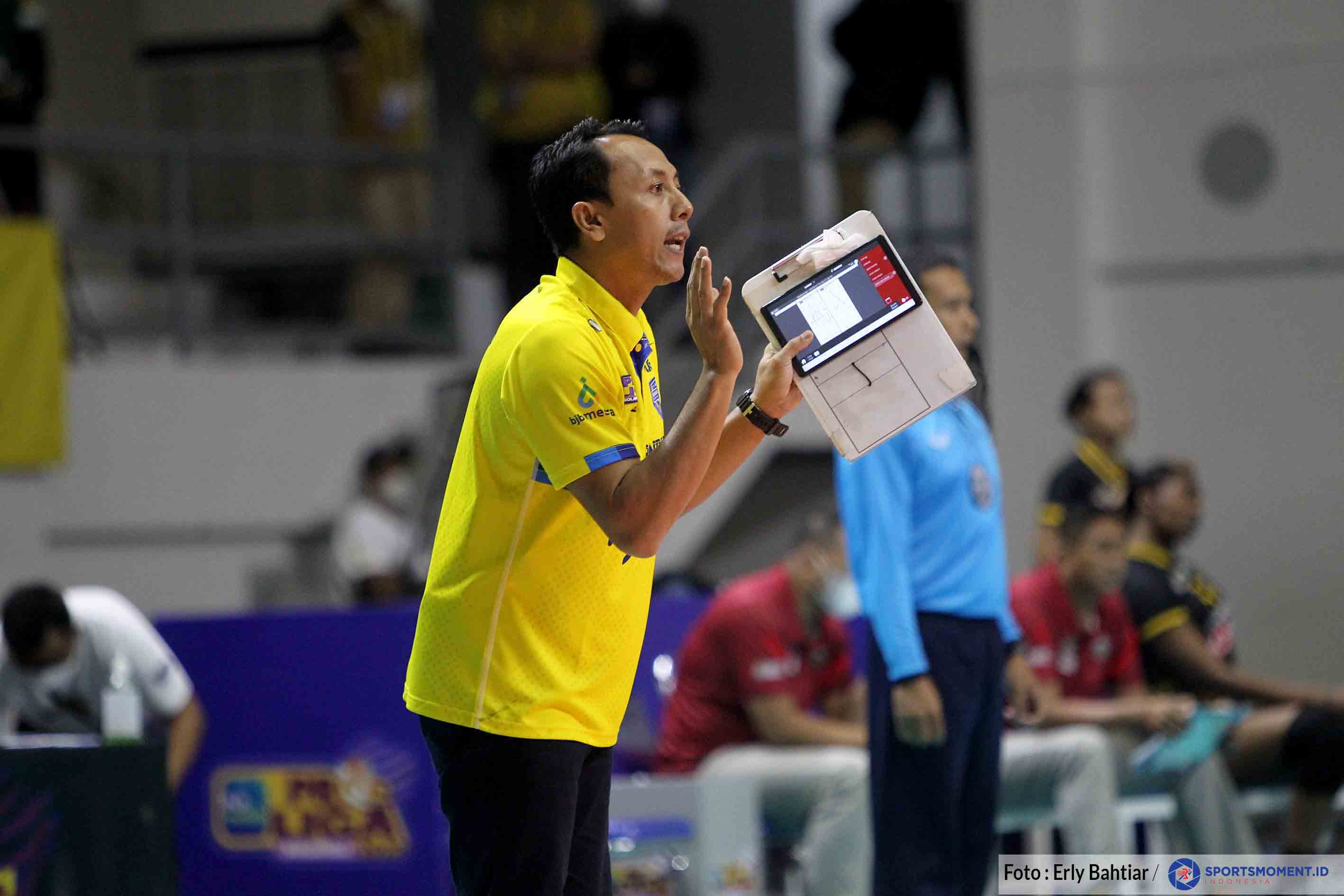 Alim Suseno pelatih bola voli putri dari Bandung bjb Tandamata terpilih sebagai pelatih terbaik sepanjang musim Proliga 2022. Ia terpilih dan diberikan apresiasi dari penyelenggara dalam bentuk uang pembinaan sebesar Rp 5 juta dan piala yang diserahkan usai final Proliga 2022 di GOR Padepokan Voli Jenderal Polisi Kunarto, Sentul, Bogor, Sabtu (26/3/2022), (Foto : Erly Bahtiar/sportsmoment.id)