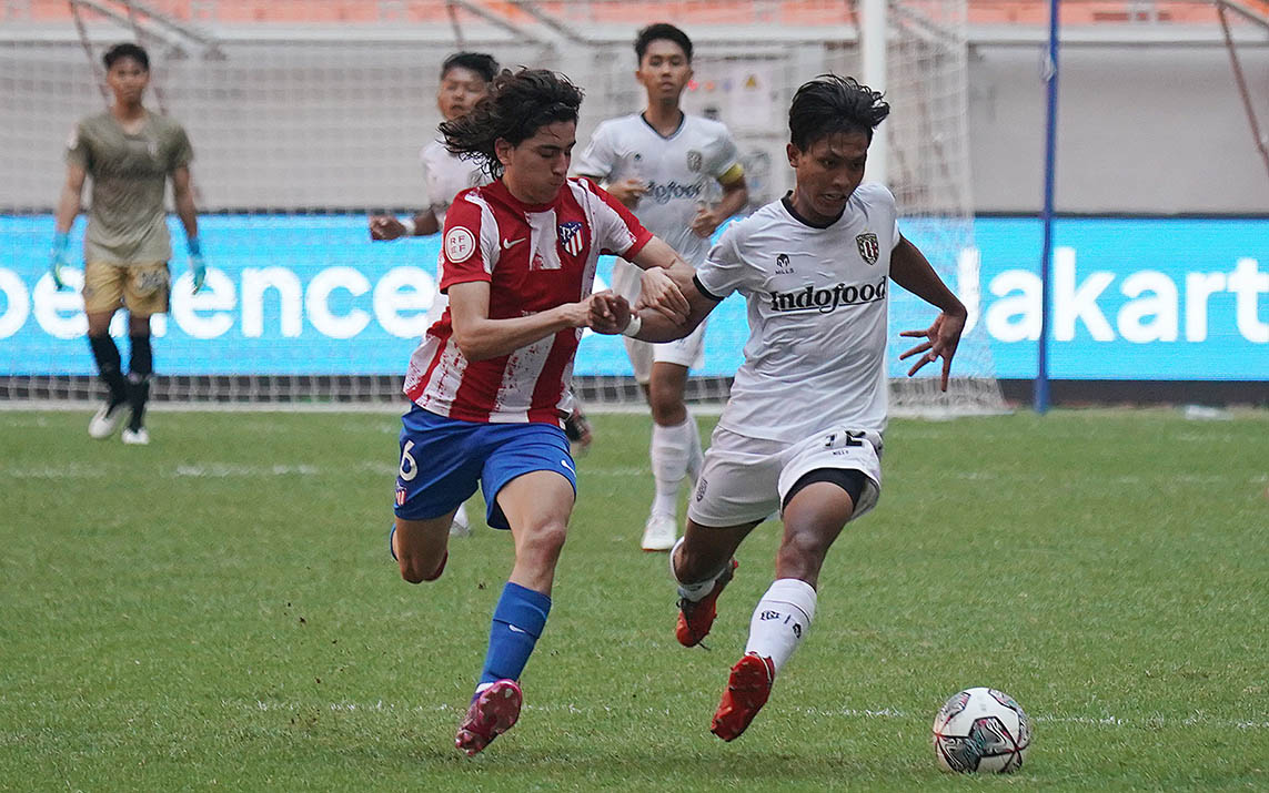 Pemain Atletico Madrid U-18, Rodrigo Emanuel Fleitas Figueredo mencoba mengawal pergerakan pemain Bali United U-18, I Nyoman Adi pada pertandingan perdana turnamen International Youth Championship yang digelar di Jakarta International Stadium, Rabu (13/3/2022). Foto : Ady Sesotya/sportsmoment.id