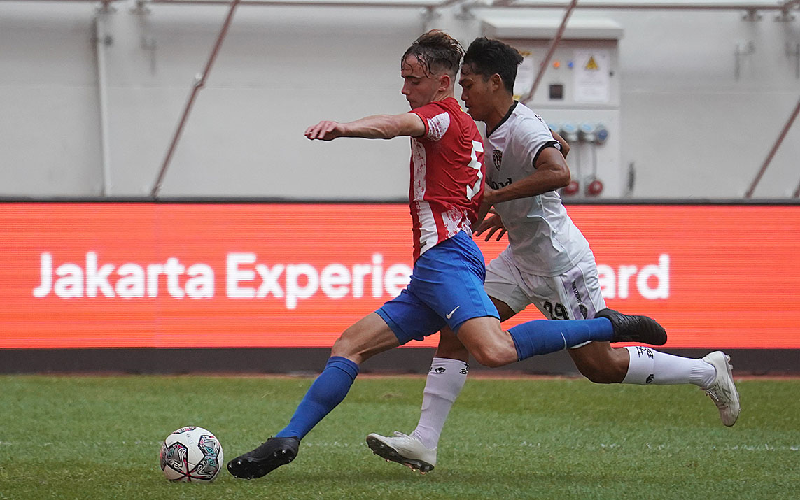 Pemain Atletico Madrid U-18, Hugo Martin Gonzalesdikawal ketat oleh pemain Bali United U-18, I Kadek Silva pada pertandingan perdana turnamen International Youth Championship yang digelar di Jakarta International Stadium, Rabu (13/3/2022). Foto : Ady Sesotya/sportsmoment.id