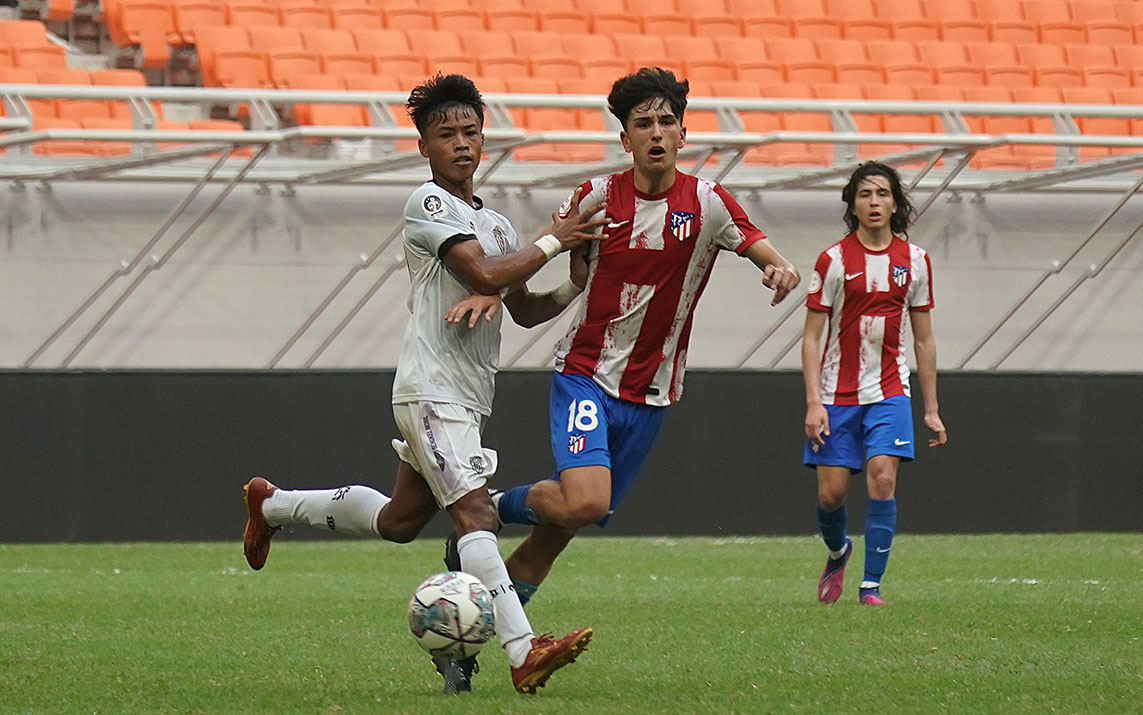 Pemain Atletico Madrid U-18, Jacobo de Oro Lorenzo (18) dikawal ketat oleh pemain Bali United U-18, I Kadek Ari Permana pada pertandingan perdana turnamen International Youth Championship yang digelar di Jakarta International Stadium, Rabu (13/3/2022). Foto : Ady Sesotya/sportsmoment.id