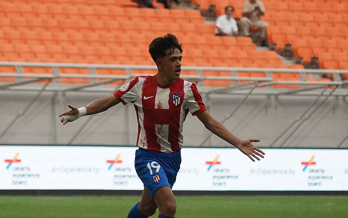 Pemain Atletico Madrid U-18, Iker Luque Sierra(19) berselebrasi usai berhasil membobol gawang Bali United U-18 pada pertandingan perdana turnamen International Youth Championship yang digelar di Jakarta International Stadium, Rabu (13/3/2022). Foto : Ady Sesotya/sportsmoment.id