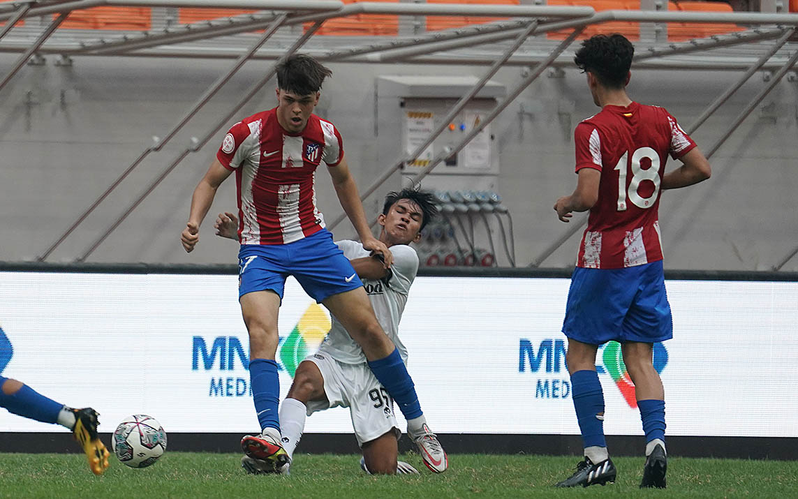 Pemain Atletico Madrid U-18, Javier Tejedor Gomez berusaha dihentikan oleh pemain Bali United U-18,I Putu Julyo pada pertandingan perdana turnamen International Youth Championship yang digelar di Jakarta International Stadium, Rabu (13/3/2022). Foto: Ady Sesotya / sportsmoment.id