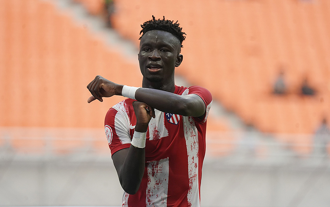 Pemain Atletico Madrid U-18, Ninte Nater Carungal berselabrasi usai berhasil membobol gawang Bali United U-18 pada pertandingan perdana turnamen International Youth Championship yang digelar di Jakarta International Stadium, Rabu (13/3/2022). Foto : Ady Sesotya/sportsmoment.id