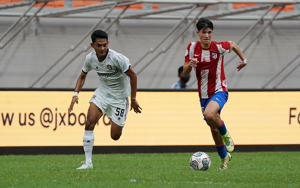 Pemain Atletico Madrid U-18, Raul Garcia Lopez berusaha dikejar oleh pemain Bali United U-18, Anak Agung Dwi Trisna pada pertandingan perdana turnamen International Youth Championship yang digelar di Jakarta International Stadium, Rabu (13/3/2022). Foto : Ady Sesotya/sportsmoment.id