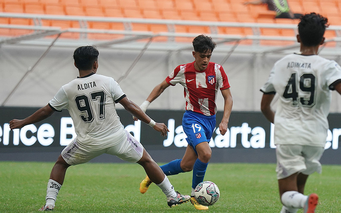 Pemain Atletico Madrid U-18, Iker Luque Sierra berusha melewati hadangan pemain Bali United U-18, I Komang Aldita pada pertandingan perdana turnamen International Youth Championship yang digelar di Jakarta International Stadium, Rabu (13/3/2022). Foto : Ady Sesotya/sportsmoment.id