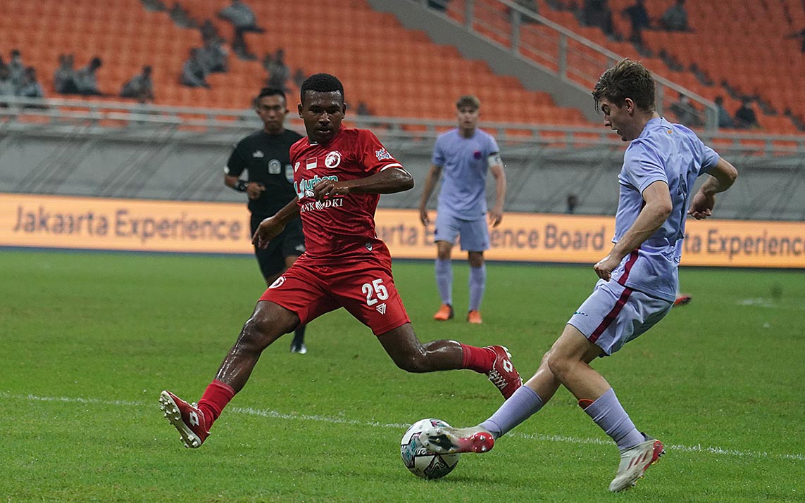 Pemain Indonesia All Stars U-20, Jimmy Julianus Aronggear (merah) memngawal pergerakan pemain FC Barcelona U-18, Antonio Martin Reina pada pertandingan International Youth Championship 2022 di Jakarta International Stadium, Rabu (30/4/2022). Pertandingan berakhir imbang dengan skor 0-0. (Foto : Ady Sesotya/sportsmoment.id)