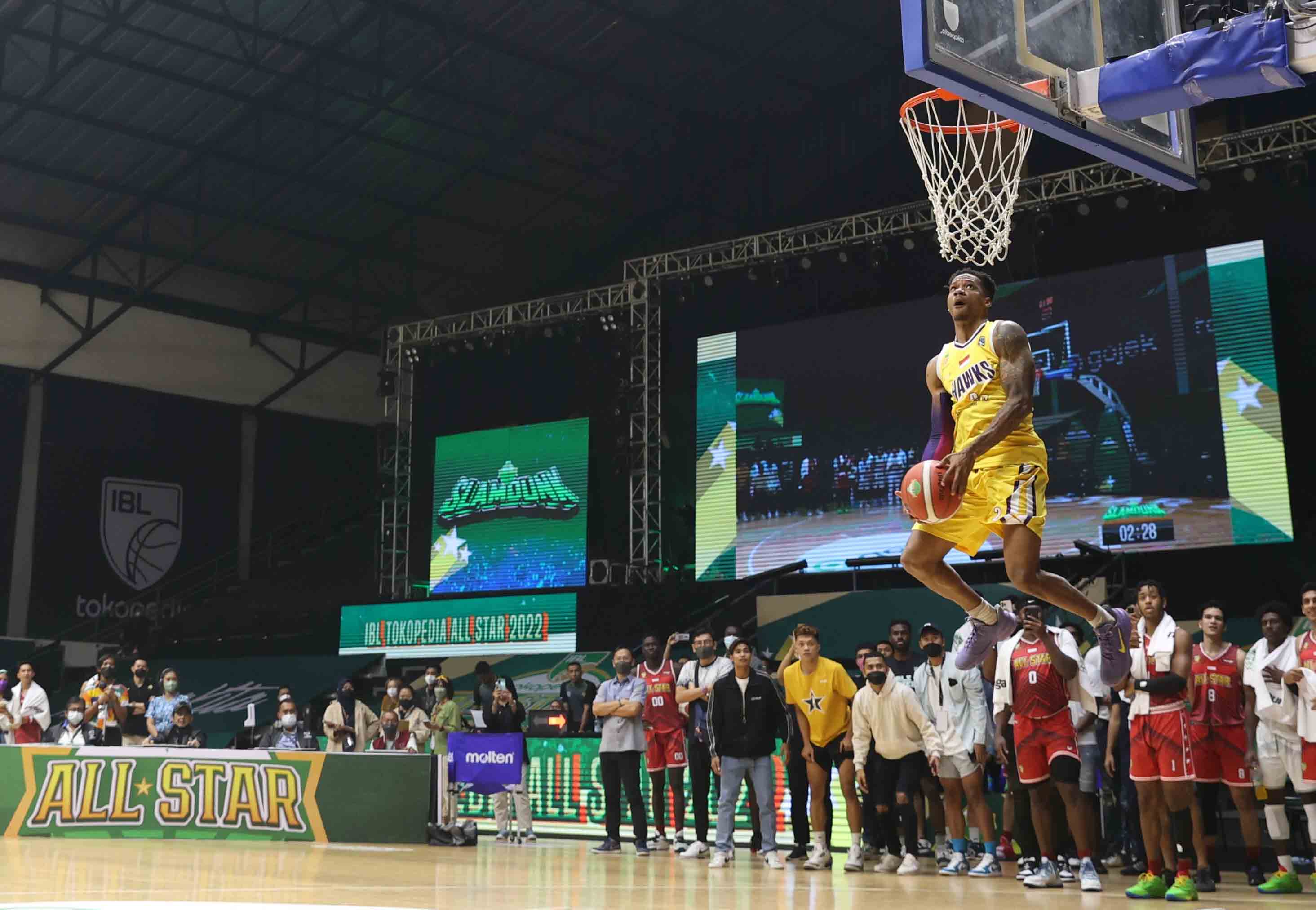 Jarron Tevanti Crump pemain dari Tangerang Hawks Basketball Club dalam aksinya di kontes Slam Dunk. Jarron berhasil menjuarai kontes slam dunk tersebut dalam gelaran Indonesian Basketball League (IBL) Star 2022, pada Kamis (31/3/2022) di Hall Senayan, Jakarta