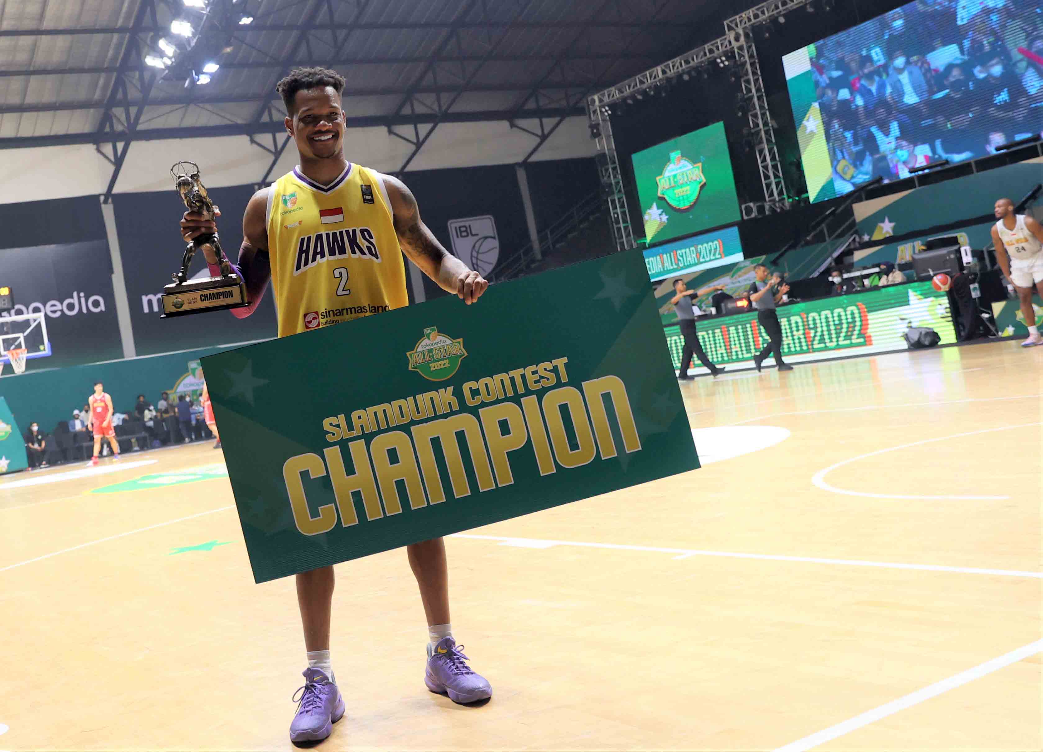 Jarron Tevanti Crump pemain dari Tangerang Hawks Basketball Club dalam aksinya di kontes Slam Dunk. Jarron berhasil menjuarai kontes slam dunk tersebut dalam gelaran Indonesian Basketball League (IBL) Star 2022, pada Kamis (31/3/2022) di Hall Senayan, Jakarta (Foto : Bobby Arifin / Sportsmoment.id)