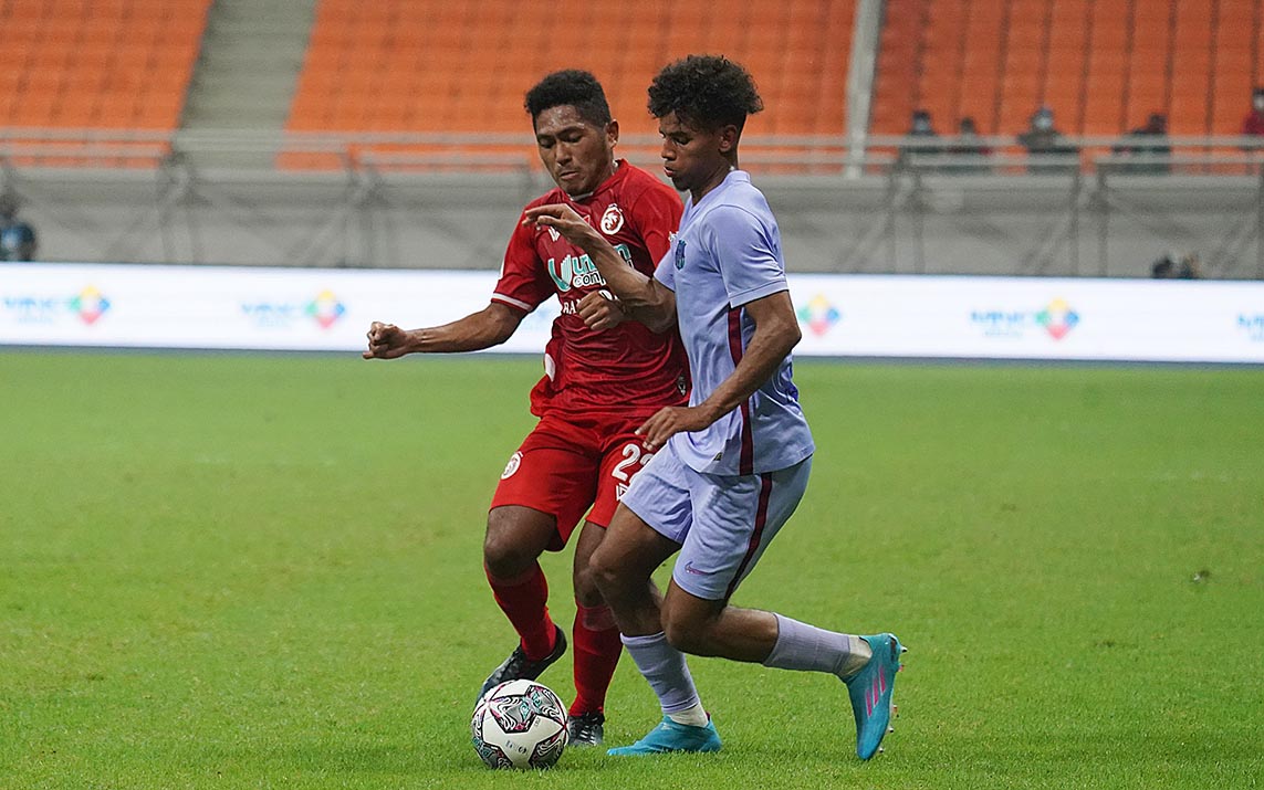 Pemain Indonesia All Stars U-20, M. Fajar Fathuro Rahman (merah) berebut bola dengan pemain FC Barcelona U-18, Jorge Javier Espinal Diaz pada pertandingan International Youth Championship 2022 di Jakarta International Stadium, Rabu (30/3/2022). Pertandingan berakhir imbang dengan skor 0-0. (Foto : Ady Sesotya/Sportsmoment.id)