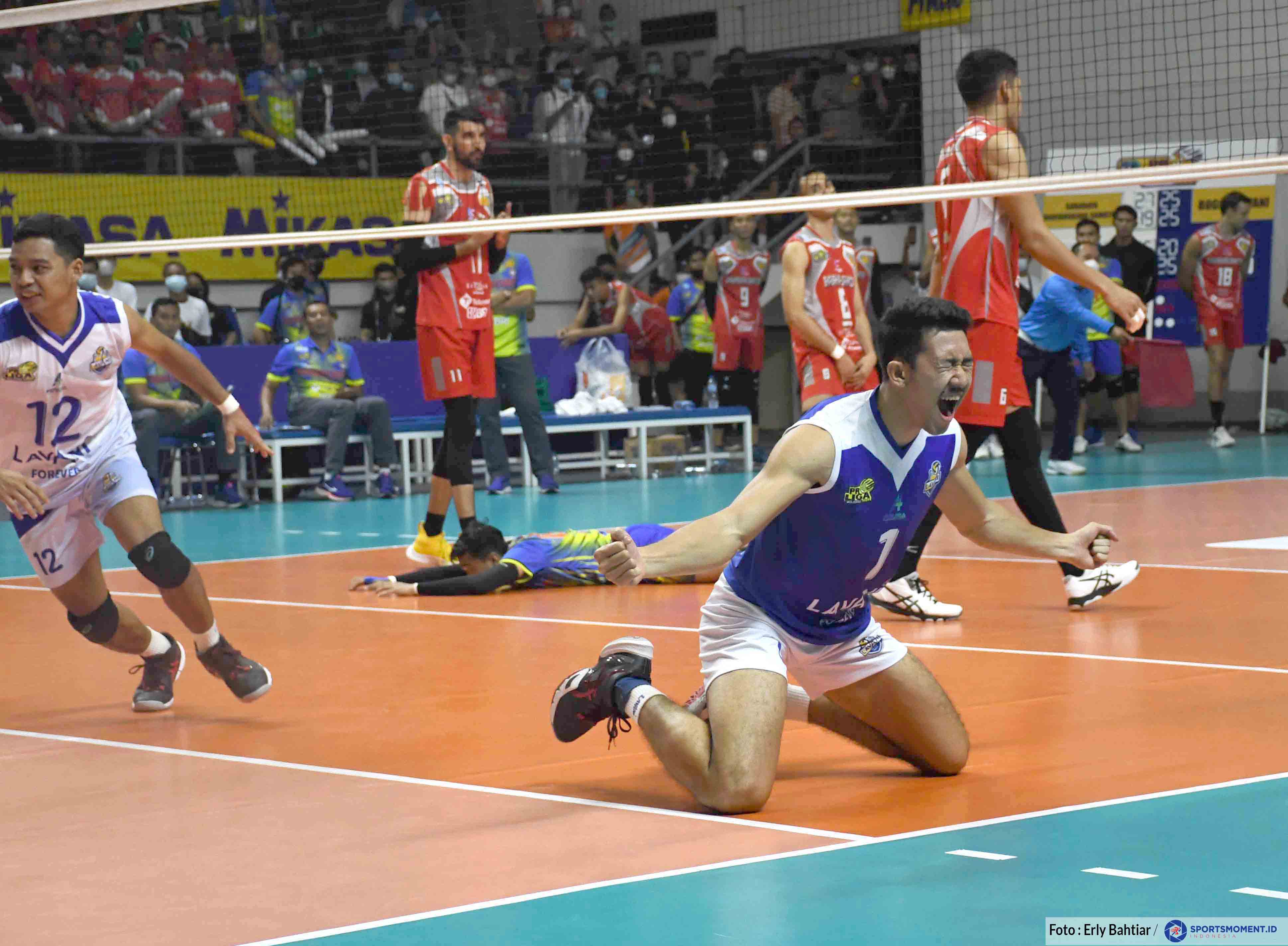Pemain putra Bogor Lavani meluapkan emosi kegembiraan pada pertandingan yang digelar di Padepokan Voli Jenderal Kunarto, Sentul, Bogor, Minggu (27/3/2022). Bogor Lavani berhasil unggul dalam pertandingan ketat. Tim asuhan pelatih asal Tiongkok Jeff Jiang tersebut menang 3-2 (25-27, 25-19, 20-25, 25-18, 15-10). (Foto : Erly Bahtiar/sportsmoment.id)