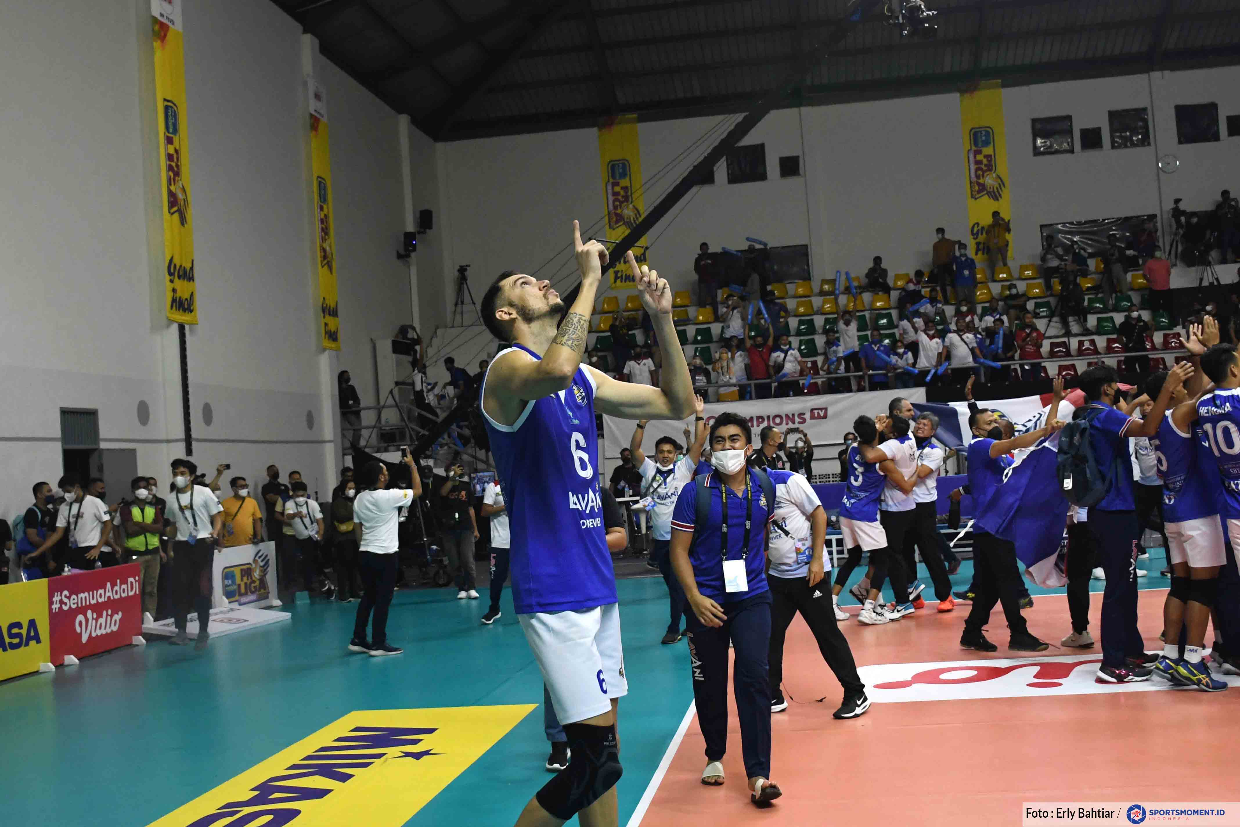 Pemain putra Bogor Lavani meluapkan emosi kegembiraan pada pertandingan yang digelar di Padepokan Voli Jenderal Kunarto, Sentul, Bogor, Minggu (27/3/2022). Bogor Lavani berhasil unggul dalam pertandingan ketat. Tim asuhan pelatih asal Tiongkok Jeff Jiang tersebut menang 3-2 (25-27, 25-19, 20-25, 25-18, 15-10). (Foto : Erly Bahtiar/sportsmoment.id)