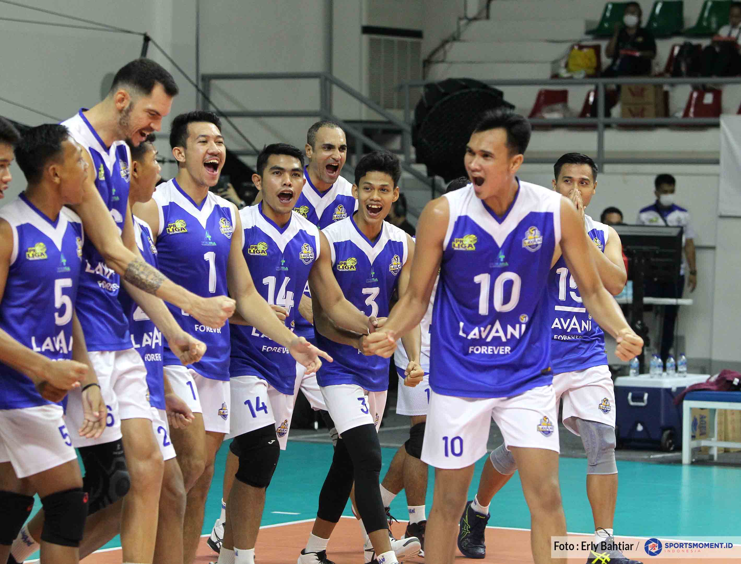 Pemain putra Bogor Lavani meluapkan emosi kegembiraan pada pertandingan yang digelar di Padepokan Voli Jenderal Kunarto, Sentul, Bogor, Minggu (27/3/2022). Bogor Lavani berhasil unggul dalam pertandingan ketat. Tim asuhan pelatih asal Tiongkok Jeff Jiang tersebut menang 3-2 (25-27, 25-19, 20-25, 25-18, 15-10). (Foto : Erly Bahtiar/sportsmoment.id)