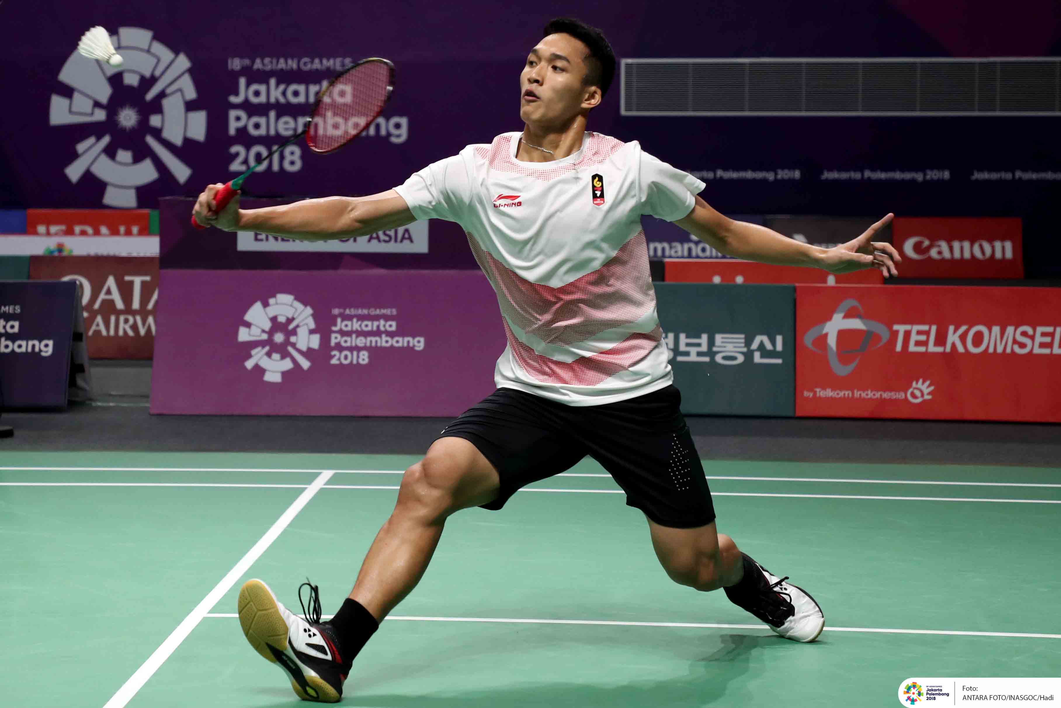 Pebulu Tangkis tunggal putra Indonesia Jonatan Christie sedang membalikan kok ke arah lawannya Cou Thienchnen China Taipei pada babak final nomor perorangan ajang Asian Games 2018 di hall istora senayan,jakarta (28/08)/INASGOC/Hadi/HO:Sportsmoment.id)