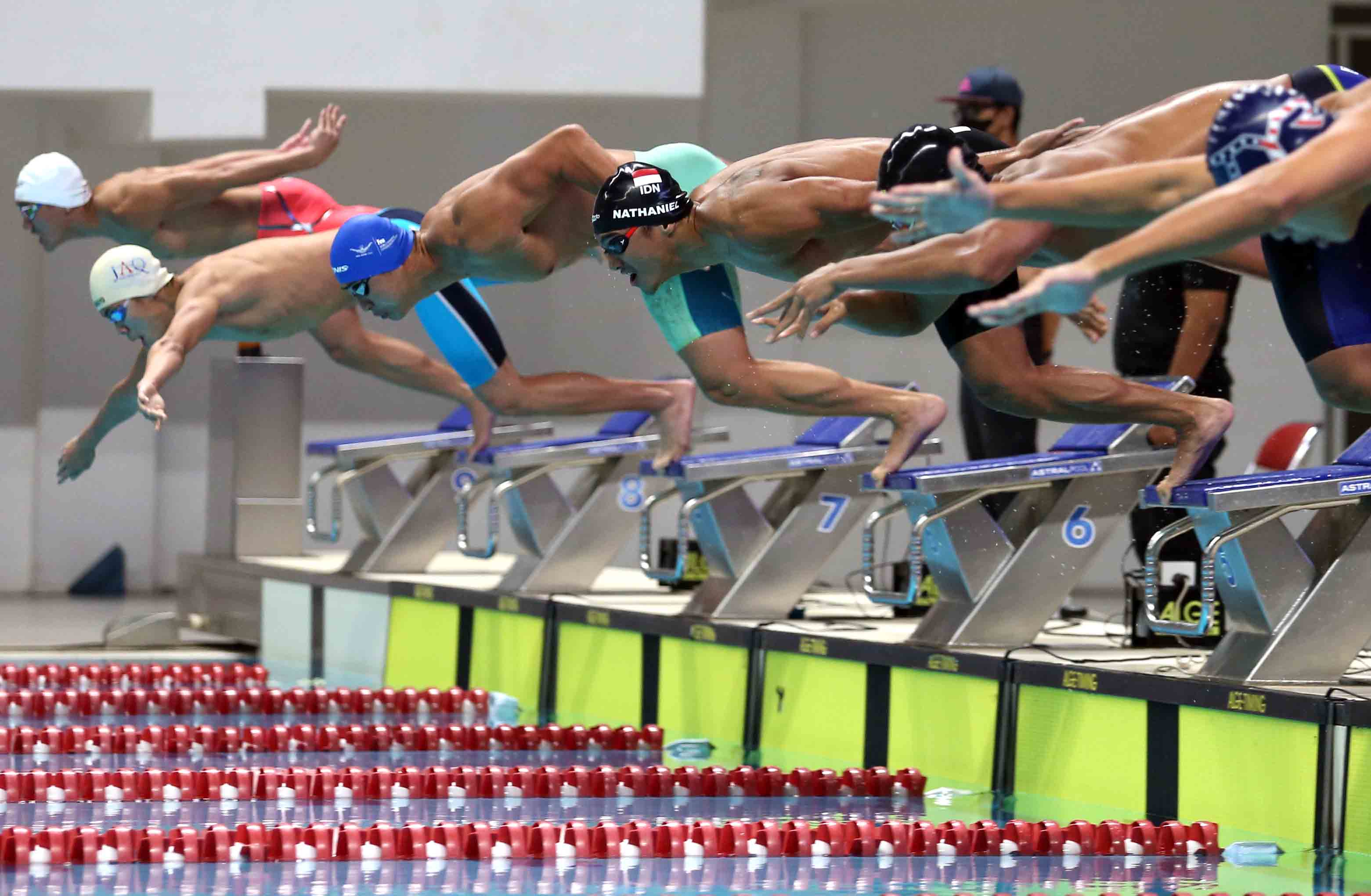 Perenang Indonesia Gagarin Nathaniel Yus saat berlomba gaya bebas 50 meter dalam Time Trial persiapan Tim Nasional Renang Indonesia menuju SEA Games 2022 Vietnam di Stadion Akuatik Gelora Bung Karno Jakarta, 22 April 2022 (Photo: Erly Bahtiar/Sportsmoment.id)