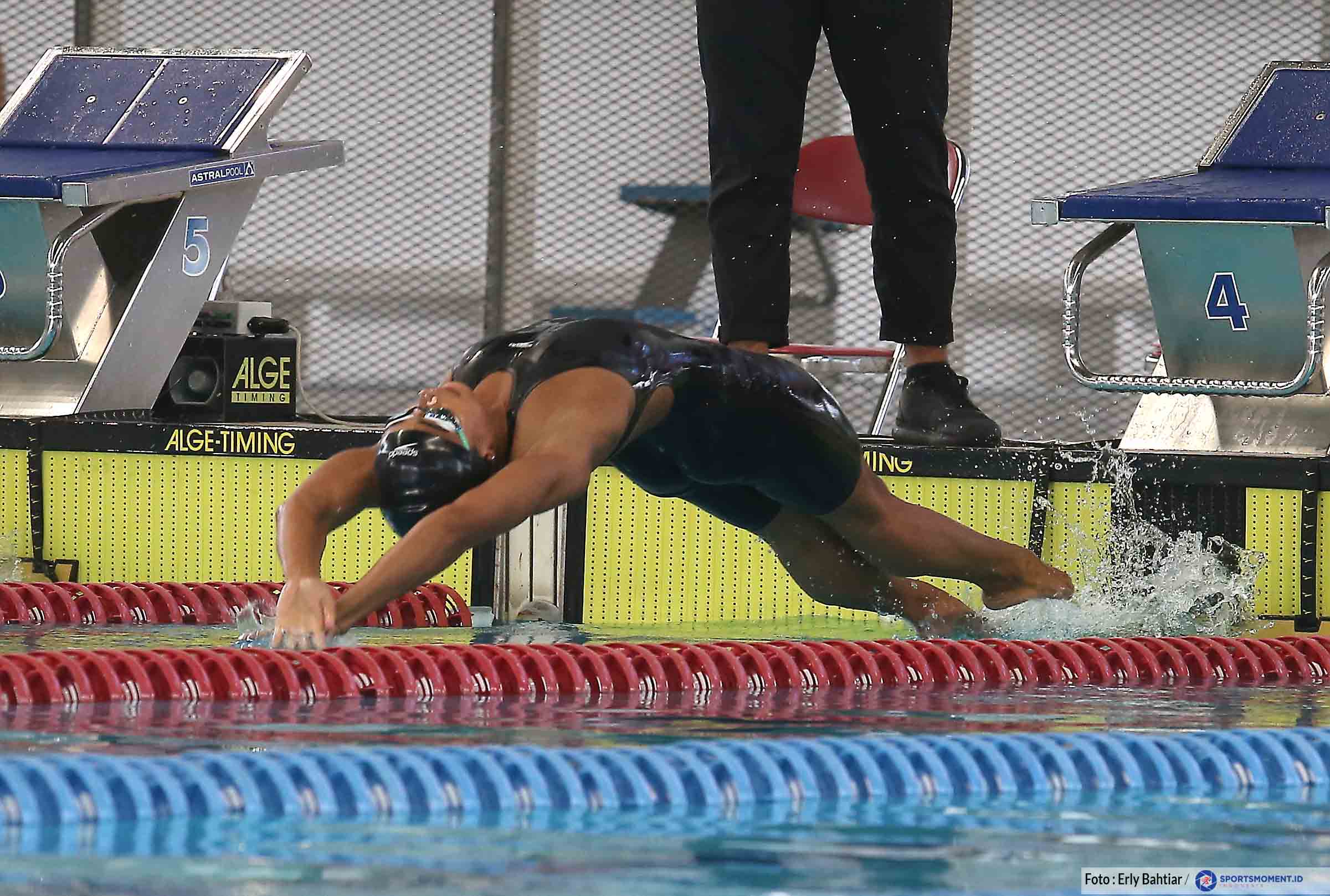 Perenang Indonesia AA Istri Kania Ratih Atmaja saat berlomba dalam event Time Trial persiapan Tim Nasional Renang Indonesia menuju SEA Games 2022 Vietnam di Stadion Akuatik Gelora Bung Karno Jakarta, Sabtu, 23 April 2022 (Photo: Erly Bahtiar/Sportsmoment.id)