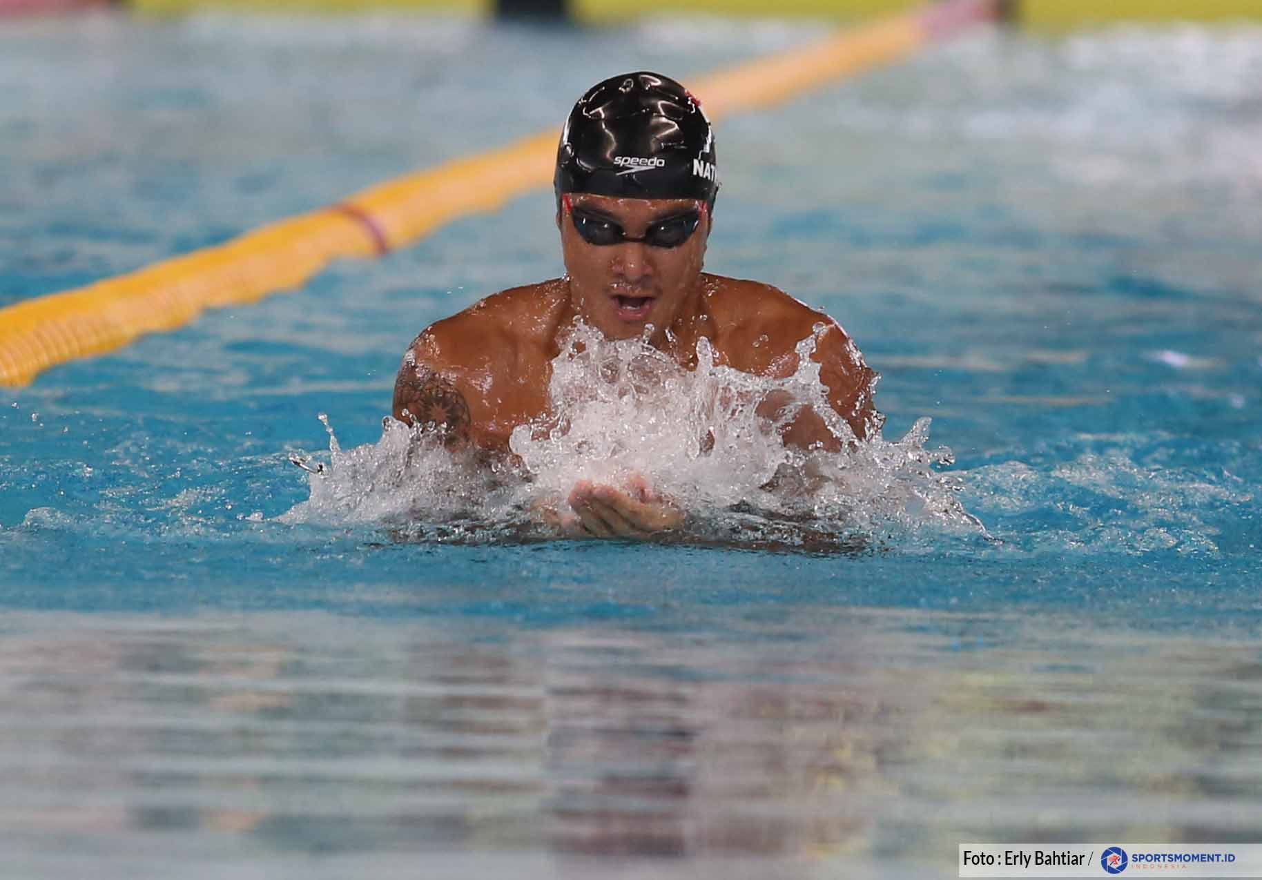 Perenang Indonesia, Gagarin Nathaniel Yus saat berlomba dalam event "Time Trial" persiapan Tim Nasional Renang Indonesia menuju SEA Games 2022 Vietnam di Stadion Akuatik Gelora Bung Karno Jakarta, Sabtu, 23 April 2022 (Photo: Erly Bahtiar/Sportsmoment.id)