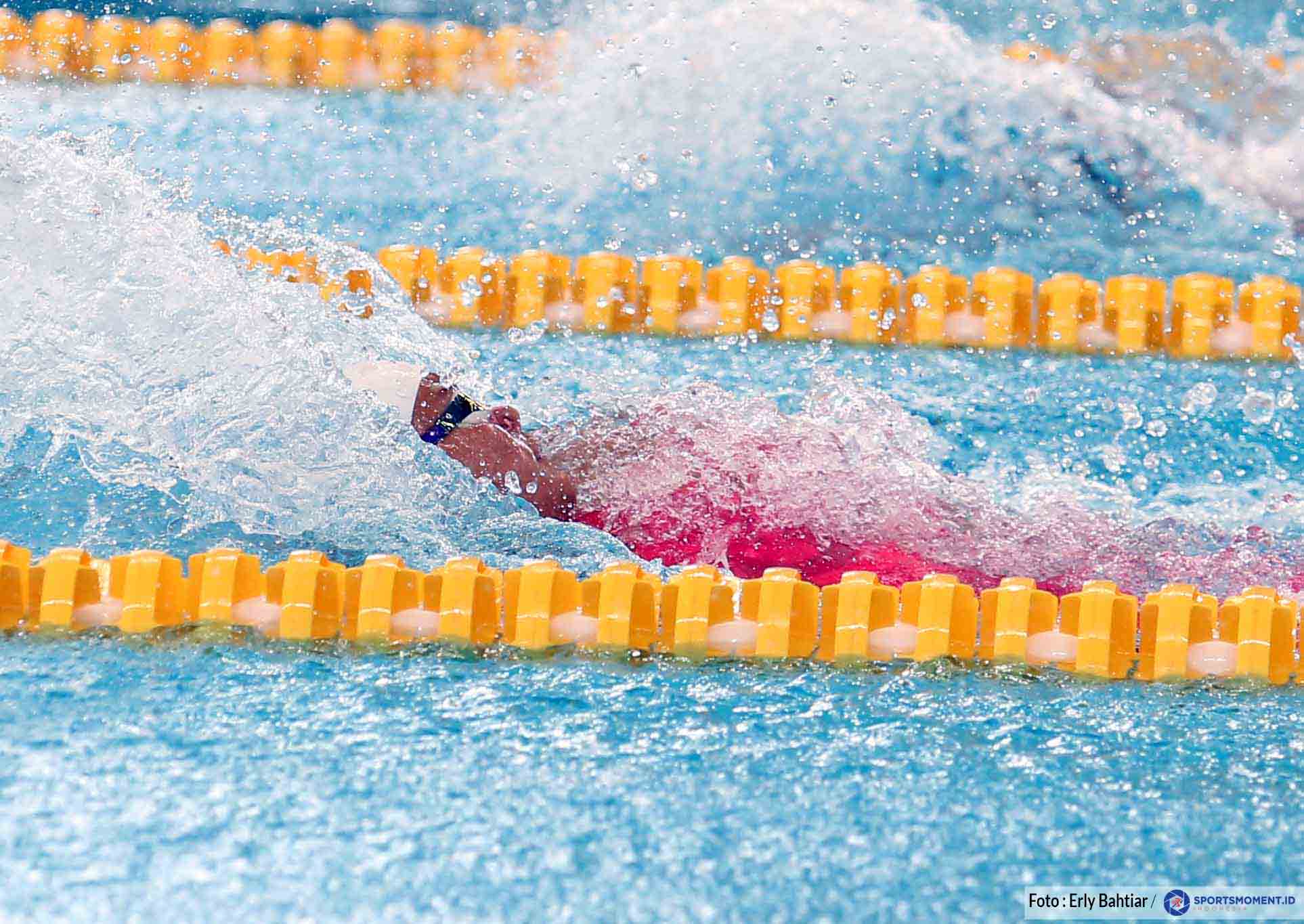 Perenang Indonesia, Flairene Candrea W saat berlomba dalam event "Time Trial" persiapan Tim Nasional Renang Indonesia menuju SEA Games 2022 Vietnam di Stadion Akuatik Gelora Bung Karno Jakarta, Sabtu, 23 April 2022 (Photo: Erly Bahtiar/Sportsmoment.id)