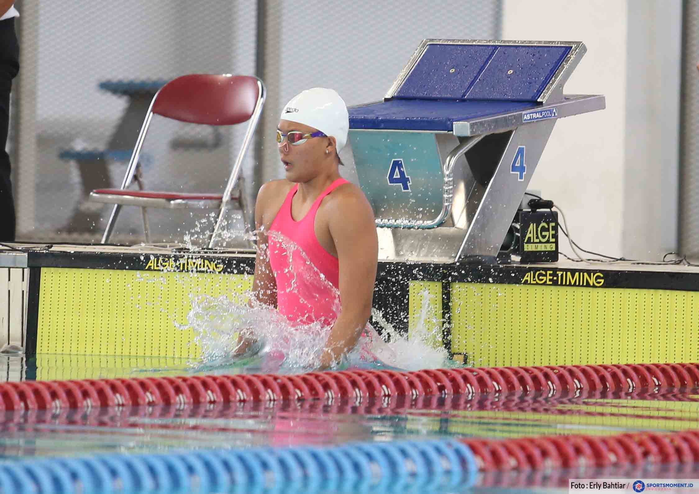 Perenang Indonesia, Flairene Candrea W saat berlomba dalam event "Time Trial" persiapan Tim Nasional Renang Indonesia menuju SEA Games 2022 Vietnam di Stadion Akuatik Gelora Bung Karno Jakarta, Sabtu, 23 April 2022 (Photo: Erly Bahtiar/Sportsmoment.id)