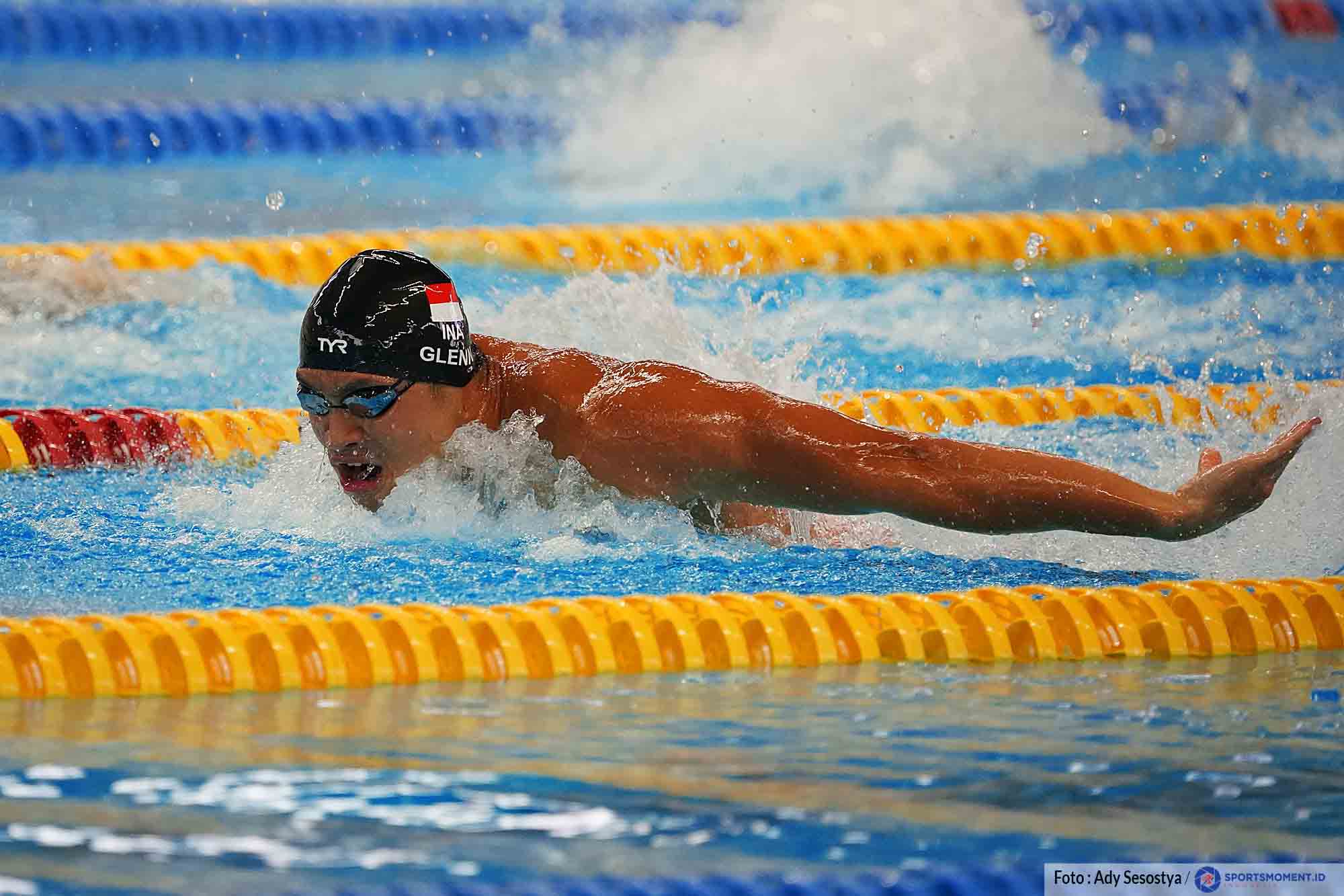 Perenang Indonesia GLENN VICTOR SUTANTO berhasil menjadi yang tercepat dengan catatan waktu 53,36 detik pada final 100 meter gaya kupu-kupu putra National Time Trial di Stadion Akuatik Gelora Bung Karno, Sabtu (23/04/2022). Ajang ini digelar sebagai persiapan akhir menjelang SEA Games 2022 Vietnam. (Photo : Ady Sesotya/Sportsmoment.id)
