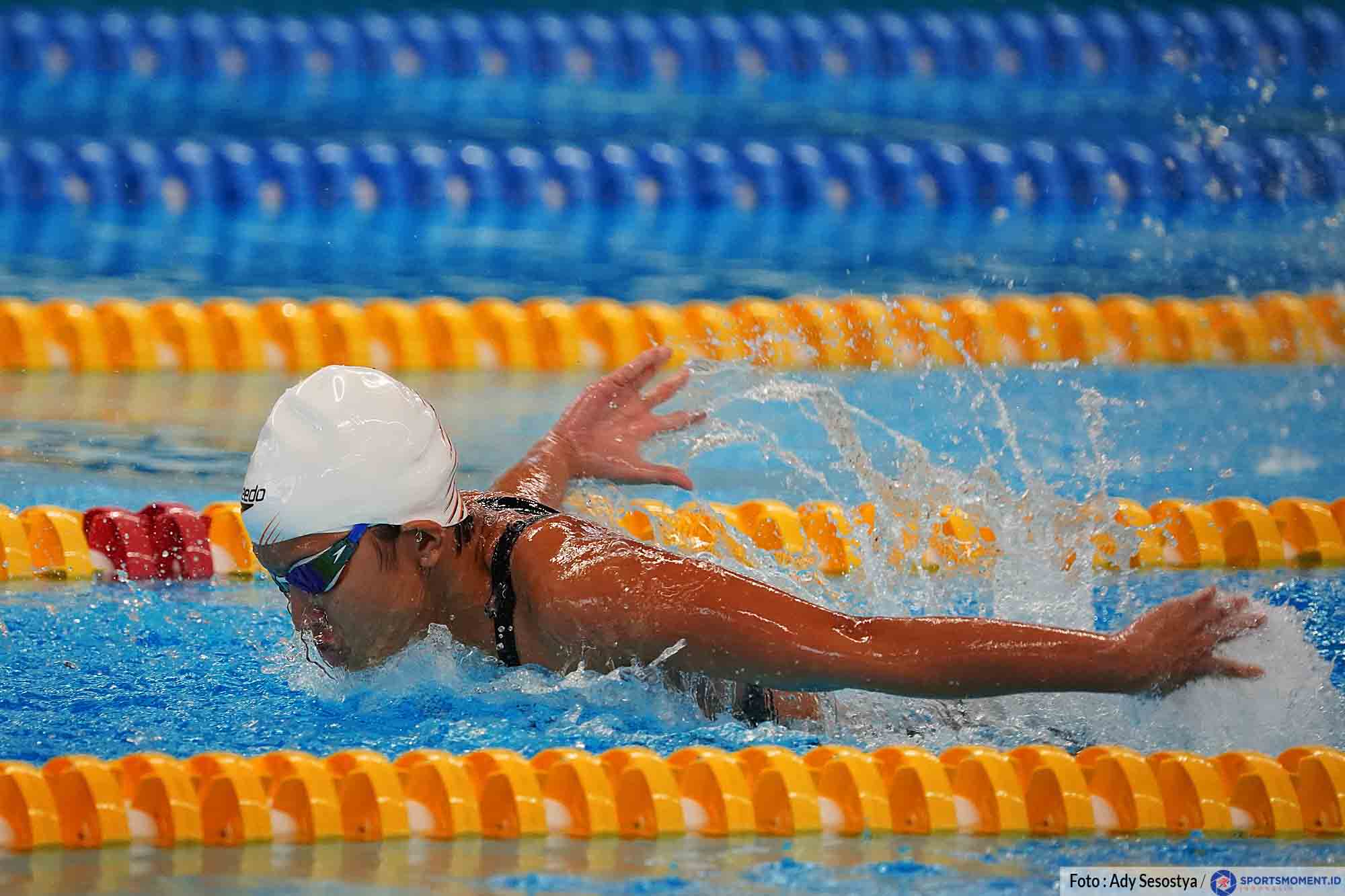 Perenang Indonesia ANGEL GABRIELLA YUS berhasil menjadi yang tercepat dengan catatan waktu 1 menit 01,99 detik pada final 100 meter gaya kupu-kupu putri National Time Trial di Stadion Akuatik Gelora Bung Karno, Sabtu (23/04/2022). Ajang ini digelar sebagai persiapan akhir menjelang SEA Games 2022 Vietnam. (Photo : Ady Sesotya/Sportsmoment.id).