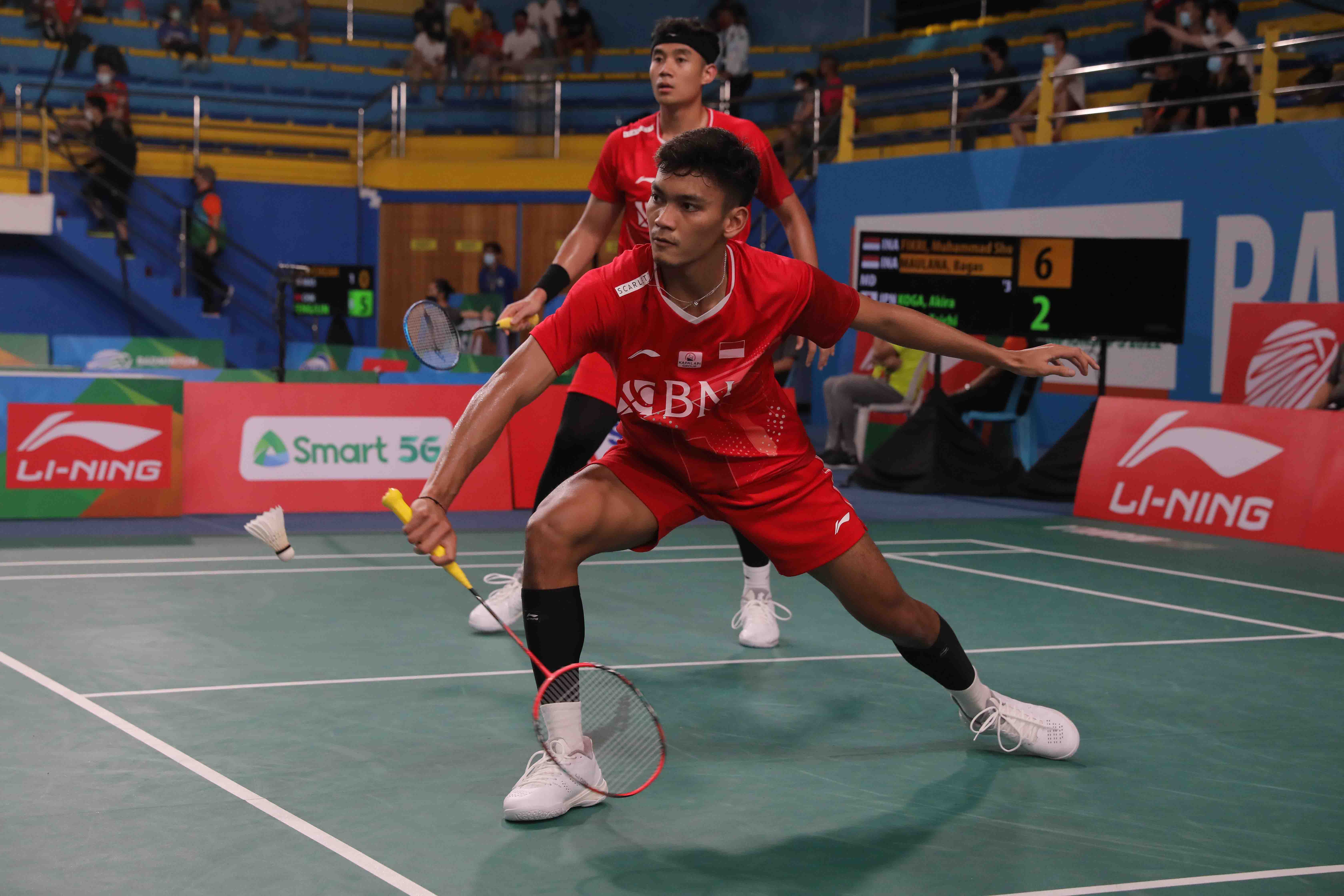 Pasangan ganda putra Indonesia, Muhammad Shohibul Fikri/Bagas Maulana pada babak 32 besar harus mengakui keunggulan ganda putra Jepang, Akira Koga/Taichi Saito pada gelaran Badminton Asia Championship 2022 yang diselenggarakan di Muntinlupa Sports Complex, Manila, Selasa (26/4). (Foto : Humas PP PBSI).
