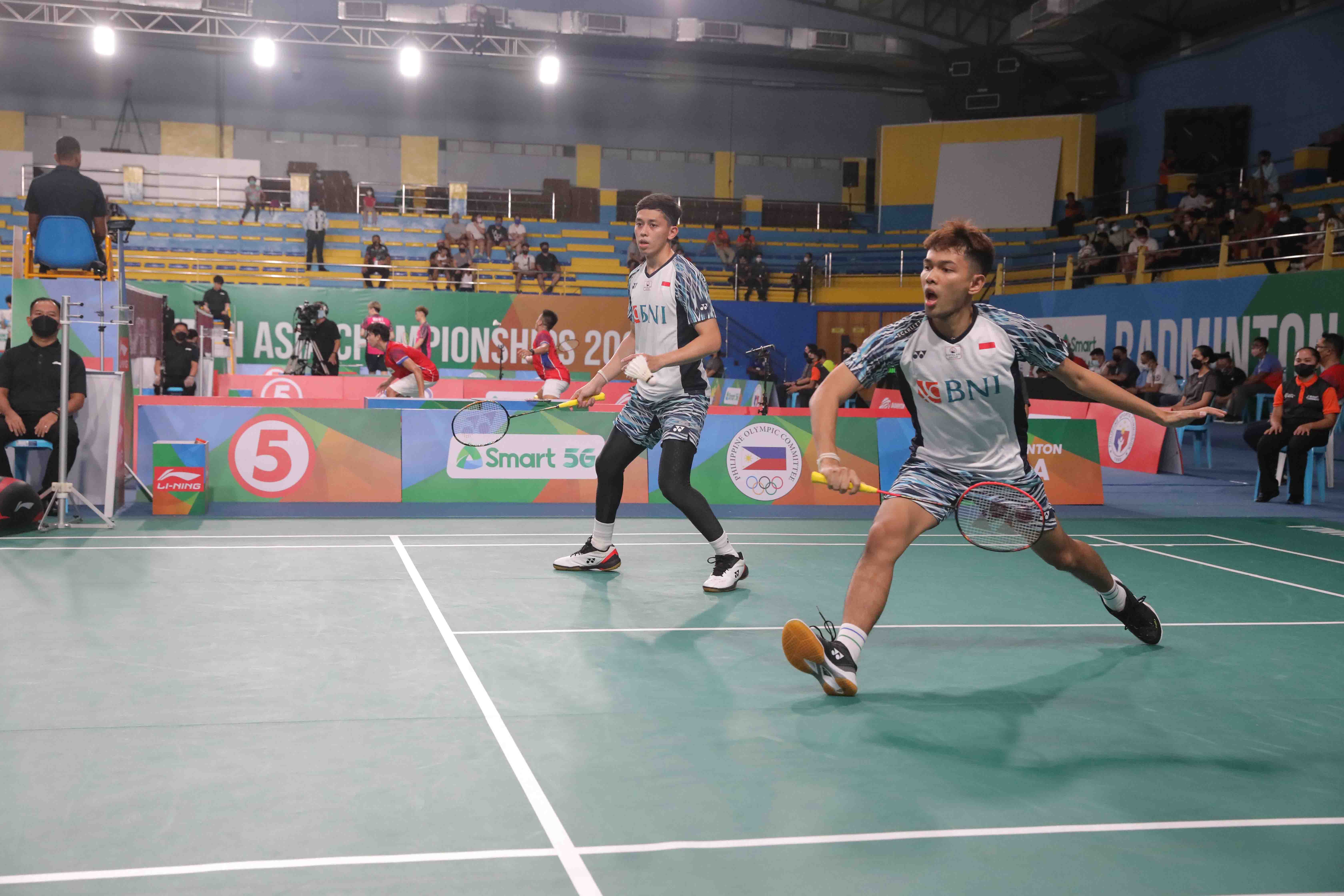 Pasangan ganda putra Indonesia, Fajar Alfian/Muhammad Rian Ardianto pada babak 32 besar berhasil mengalahkan ganda putra India, M.R Arjun/Dhruv Kapila pada gelaran Badminton Asia Championship 2022 yang diselenggarakan di Muntinlupa Sports Complex, Manila, Selasa (26/4). (Foto : Humas PP PBSI).