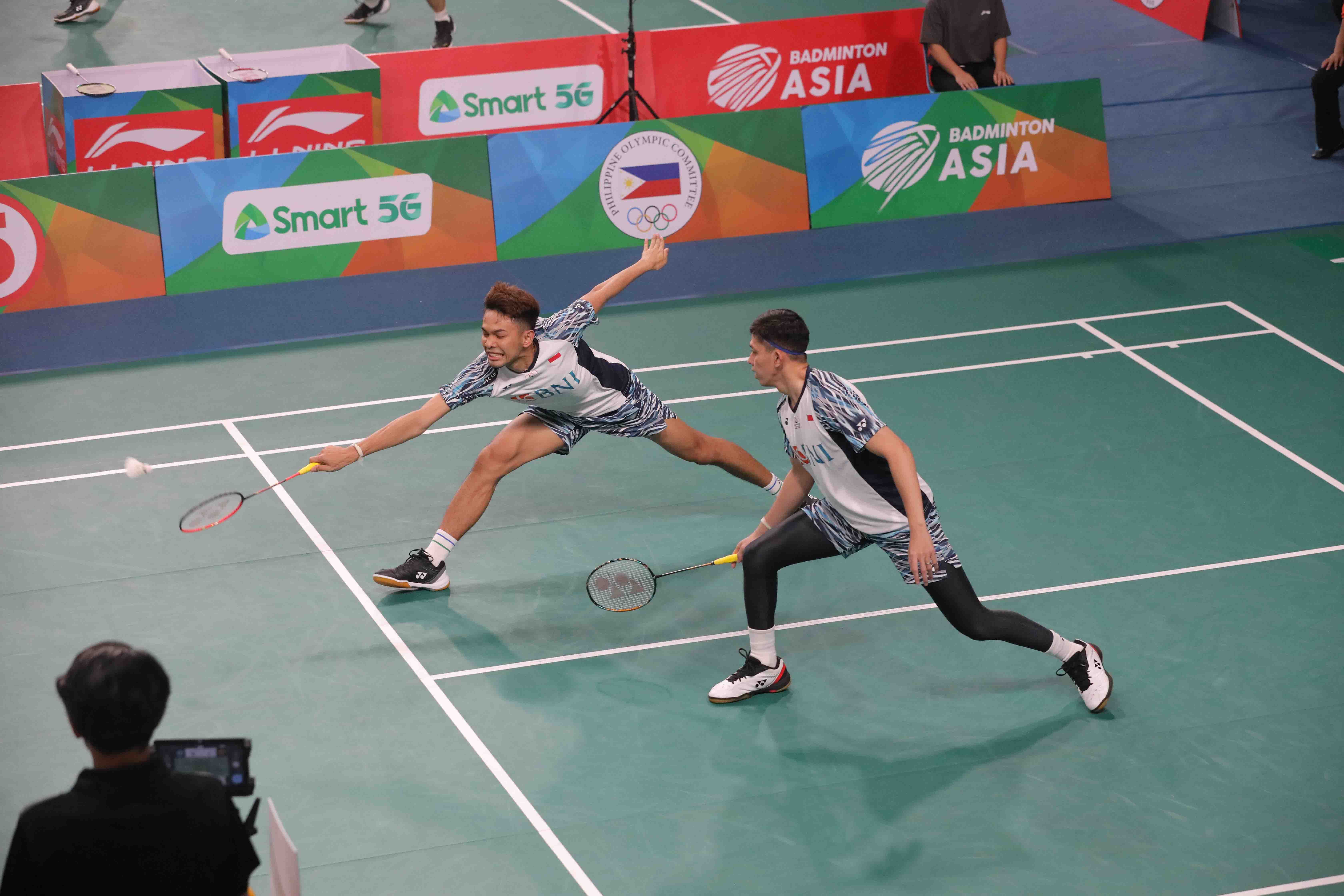 Pasangan ganda putra Indonesia, Fajar Alfian/Muhammad Rian Ardianto pada babak 32 besar berhasil mengalahkan ganda putra India, M.R Arjun/Dhruv Kapila pada gelaran Badminton Asia Championship 2022 yang diselenggarakan di Muntinlupa Sports Complex, Manila, Selasa (26/4). (Foto : Humas PP PBSI). ,