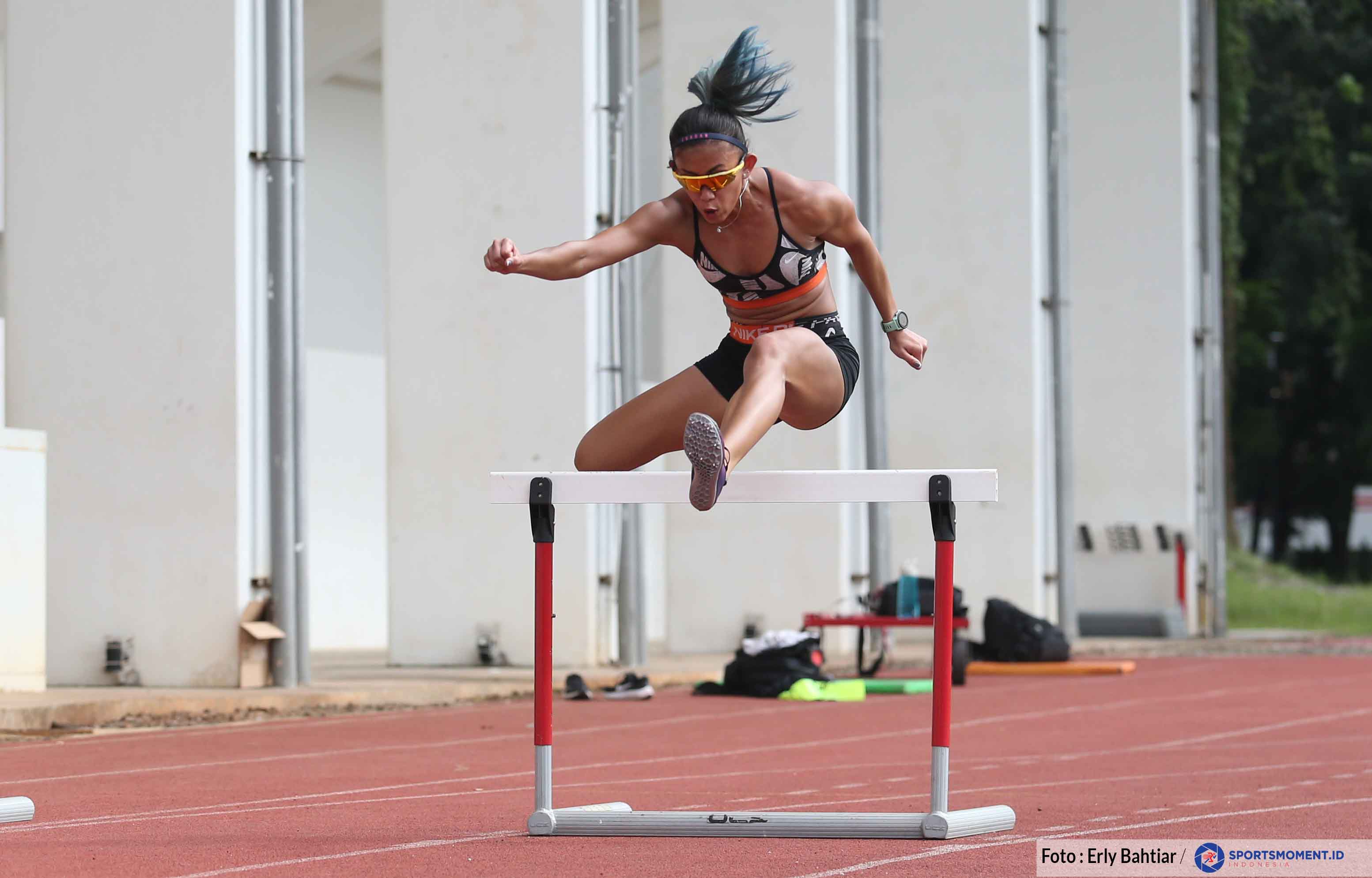 Atlet lompat Gawang Indonesia, Emilia Nova melakukan latihan persiapan untuk mengikuti SEA Games 2021 di Vietnam pada Jumat, 29 April 2022 di Stadion Madya GBK Senayan Jakarta (Photo: Erly Bahtiar/Sportsmoment.id)