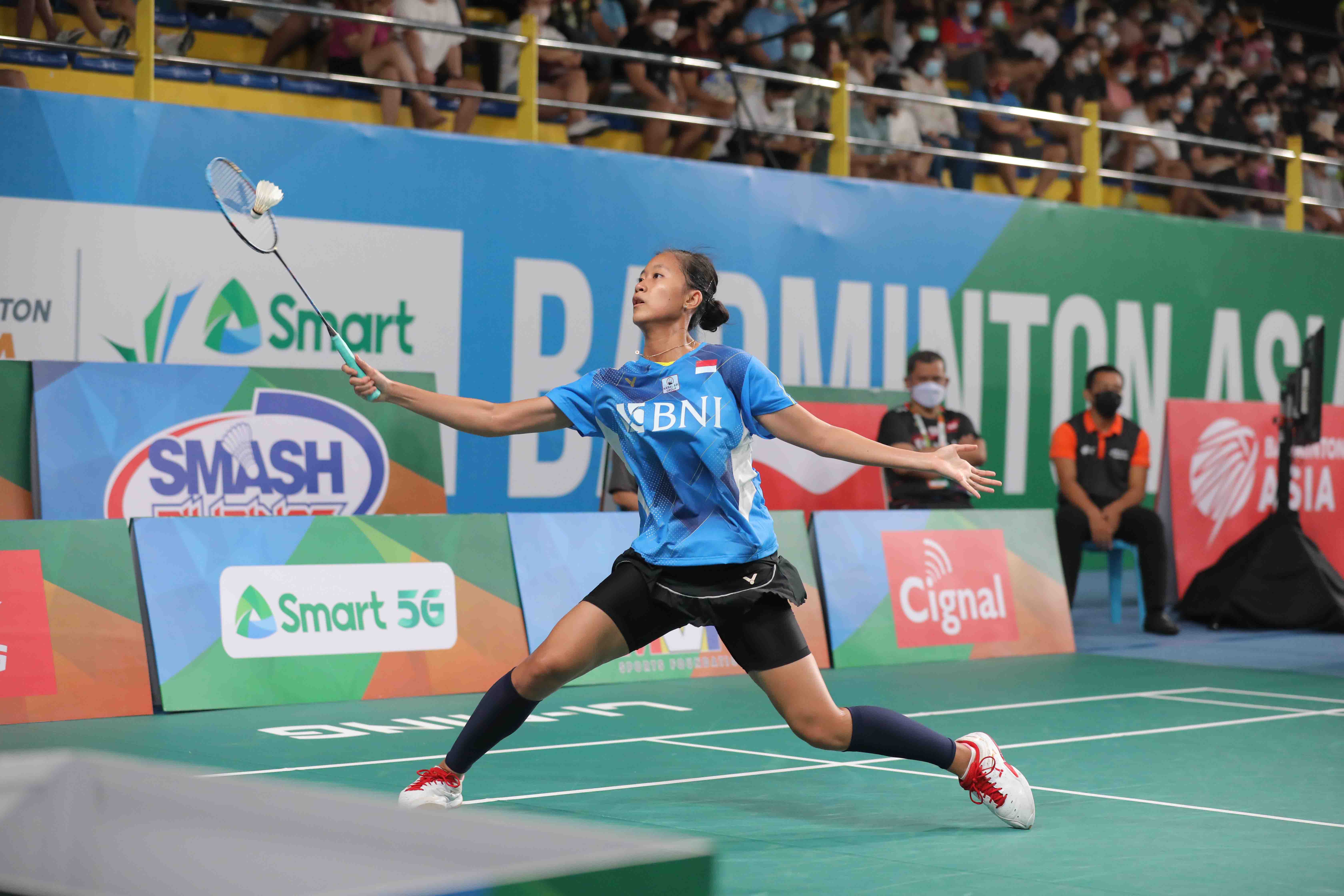 Pemain tunggal putri Indonesia, Putri Kusuma Wardani pada babak 32 besar berhasil mengalahkan tunggal putri Korea, Kim Ga Eun pada gelaran Badminton Asia Championship 2022 yang diselenggarakan di Muntinlupa Sports Complex, Manila, Rabu (27/4). (Foto : Humas PP PBSI)