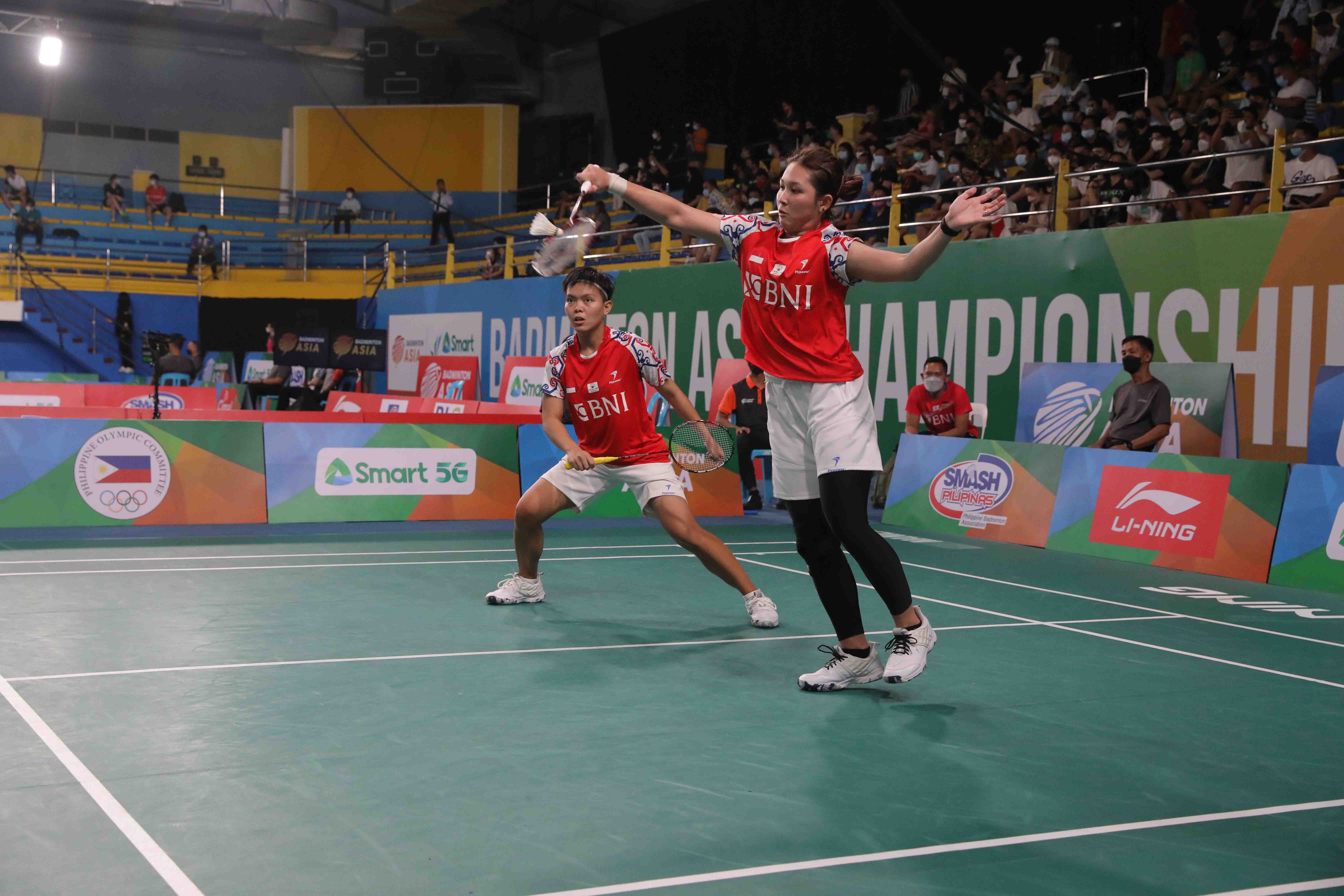 Pasangan ganda putri Indonesia, Siti Fadia Silva Ramadhanti/Ribka Sugiarto pada babak 32 besar berhasil mengalahkan unggulan ketiga asal Korea, Kim Soyeong/Kong Heeyong pada gelaran Badminton Asia Championship 2022 yang diselenggarakan di Muntinlupa Sports Complex, Manila, Rabu (27/4). (Foto : Humas PP PBSI)