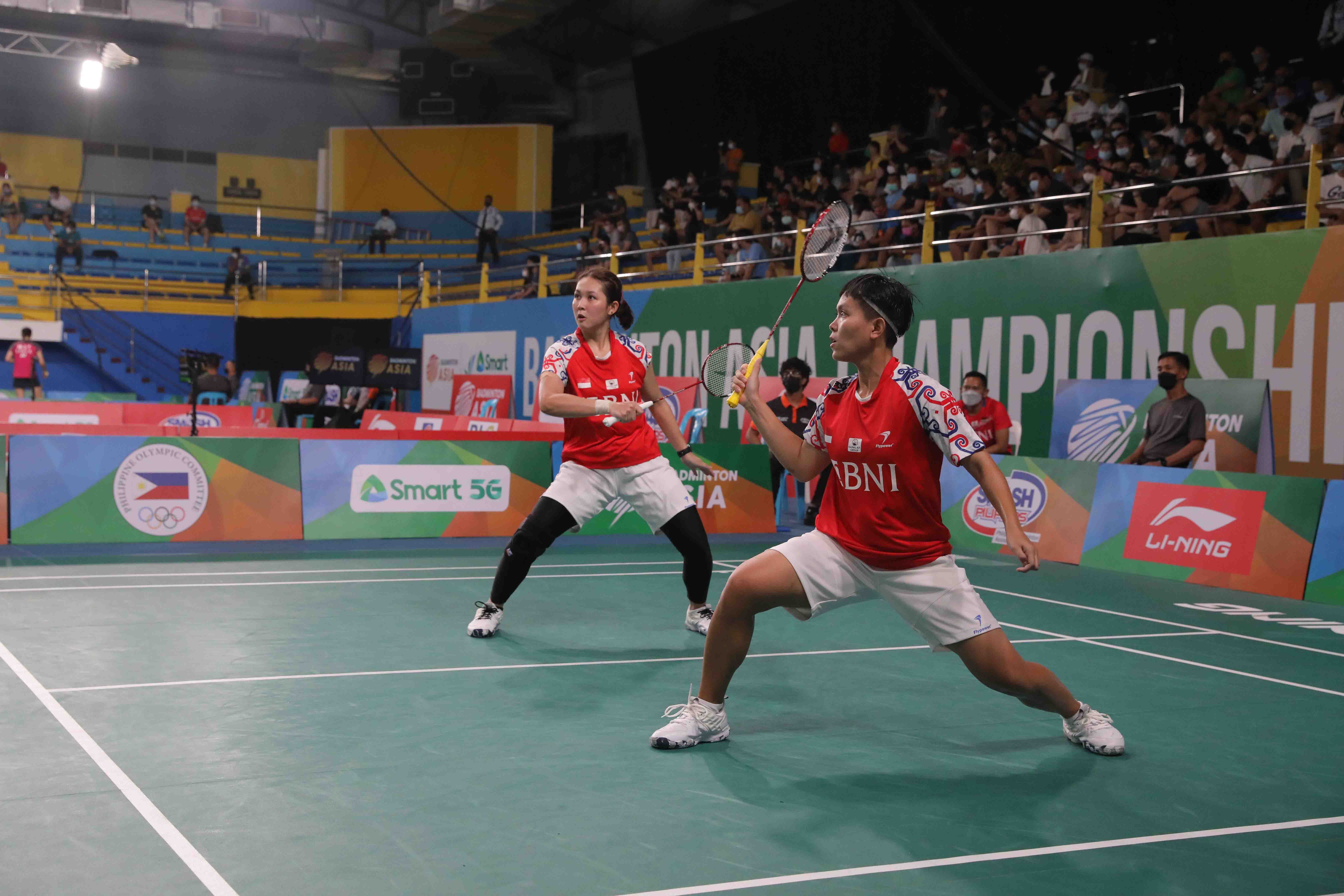 Pasangan ganda putri Indonesia, Siti Fadia Silva Ramadhanti/Ribka Sugiarto pada babak 32 besar berhasil mengalahkan unggulan ketiga asal Korea, Kim Soyeong/Kong Heeyong pada gelaran Badminton Asia Championship 2022 yang diselenggarakan di Muntinlupa Sports Complex, Manila, Rabu (27/4). (Foto : Humas PP PBSI)