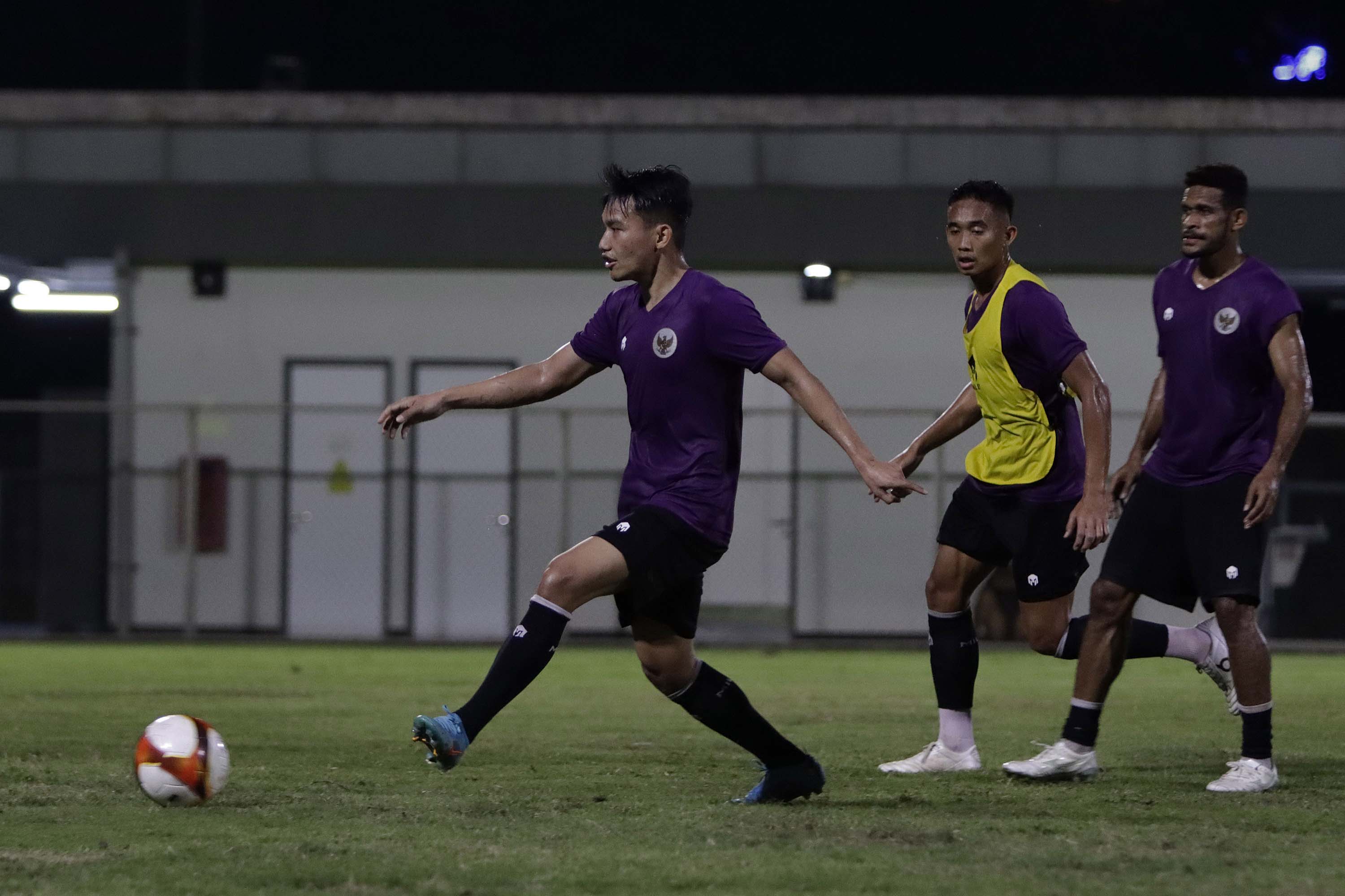 Pemain Tim Nasional U-23 Indonesia, Witan Sulaiman (kiri), Rizky Ridho (tengah) dan Ricky Kambuaya (kanan) saat menjalani latihan terakhir di Lapangan B Komplek Gelora Bung Karno, Minggu (1/5/2022) jelang berlaga di ajang SEA Games XXXI Vietnam. (Foto : Ady Sesotya/Sportsmoment.id)