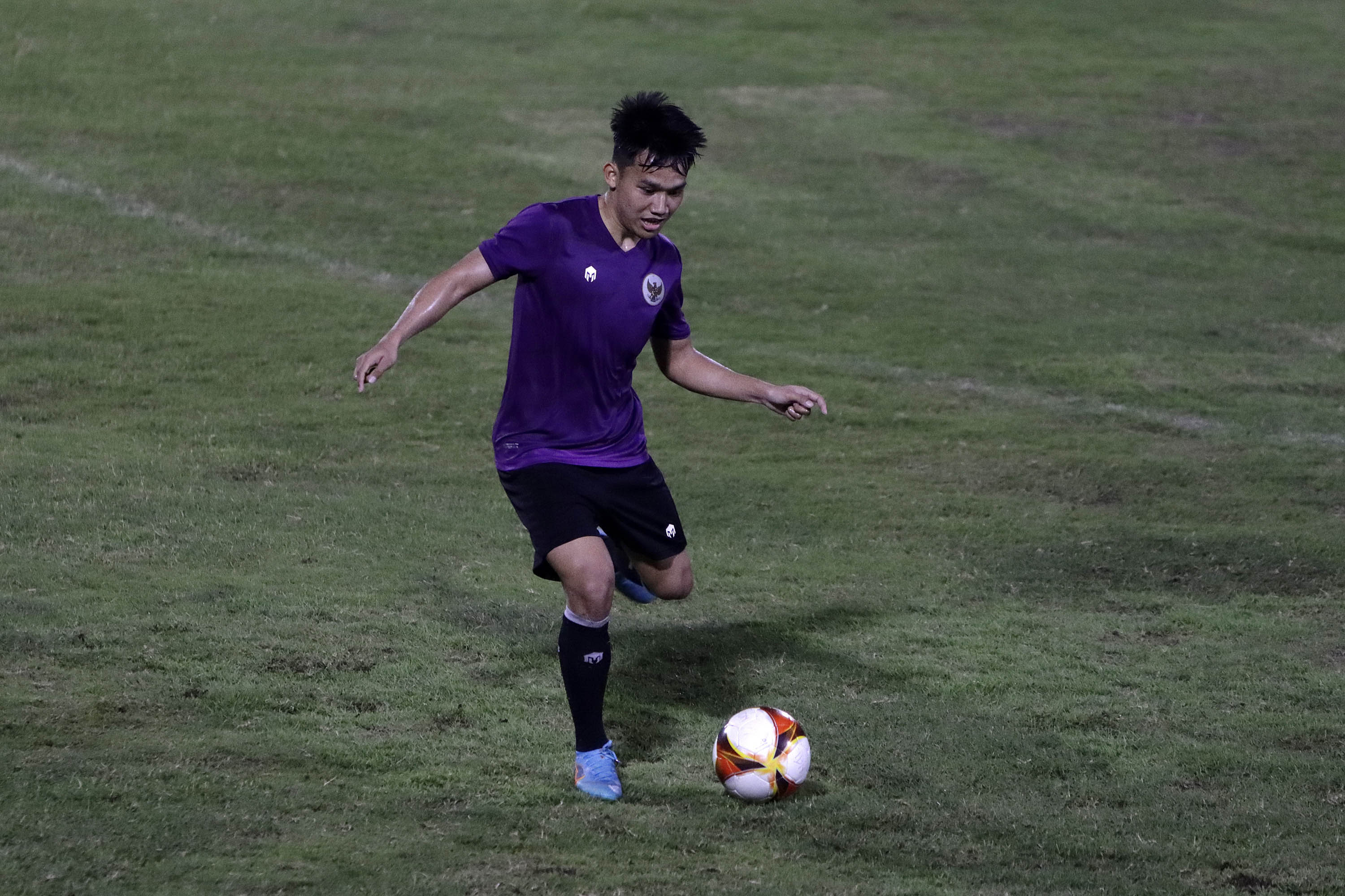 Pemain Tim Nasional U-23 Indonesia, Witan Sulaiman saat menjalani latihan terakhir di Lapangan B Komplek Gelora Bung Karno, Minggu (1/5/2022) jelang berlaga di ajang SEA Games XXXI Vietnam. (Foto : Ady Sesotya/Sportsmoment.id)