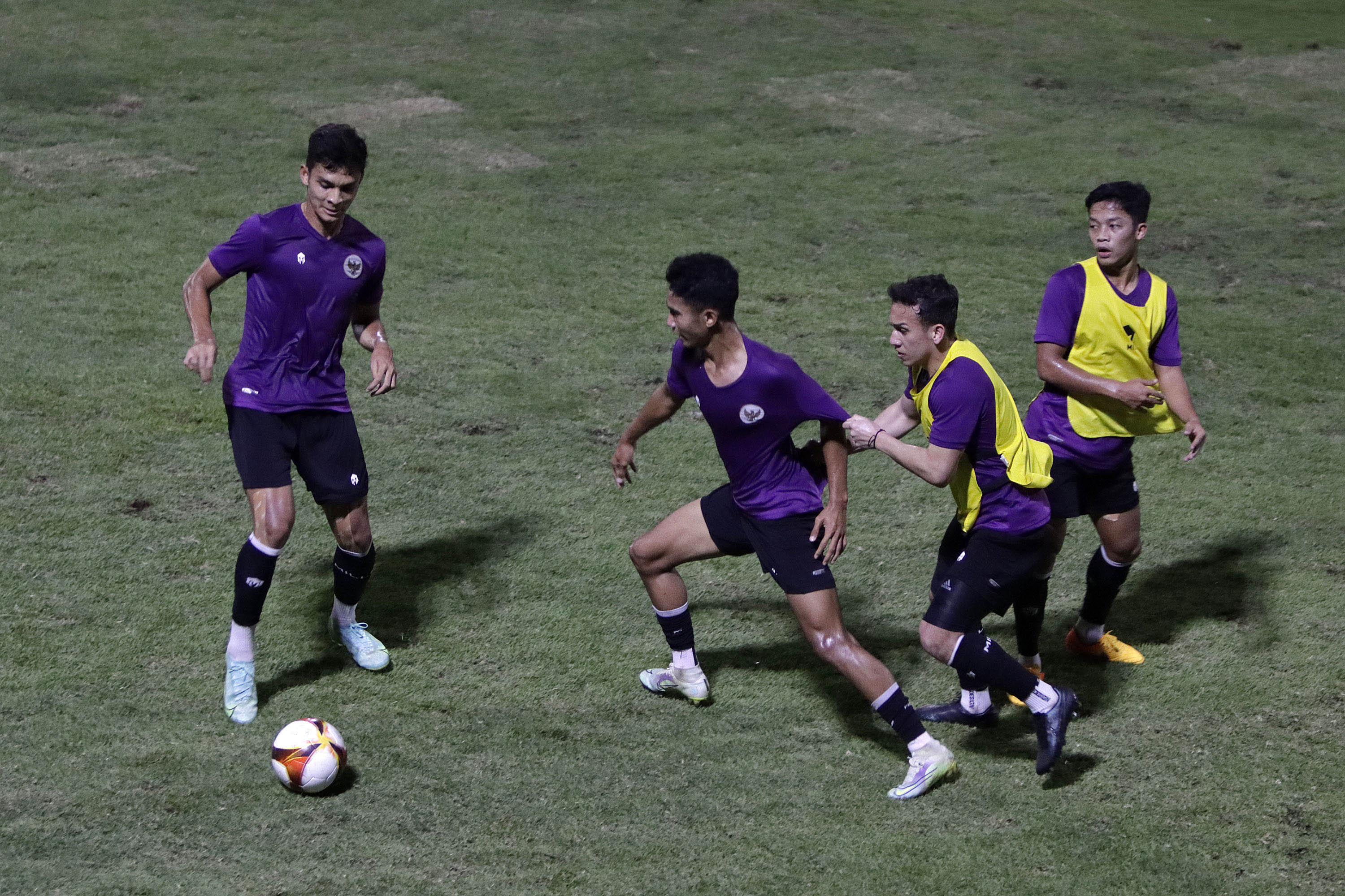 Pemain Tim Nasional U-23 Indonesia, M. Ridwan (kiri), Marselino Ferdinand (kedua dari kiri), Egy Maulana Vikri (ketiga dari kiri) dan Rio Fahmi (kanan) saat menjalani latihan terakhir di Lapangan B Komplek Gelora Bung Karno, Minggu (1/5/2022) jelang berlaga di ajang SEA Games XXXI Vietnam. (Foto : Ady Sesotya/Sportsmoment.id)