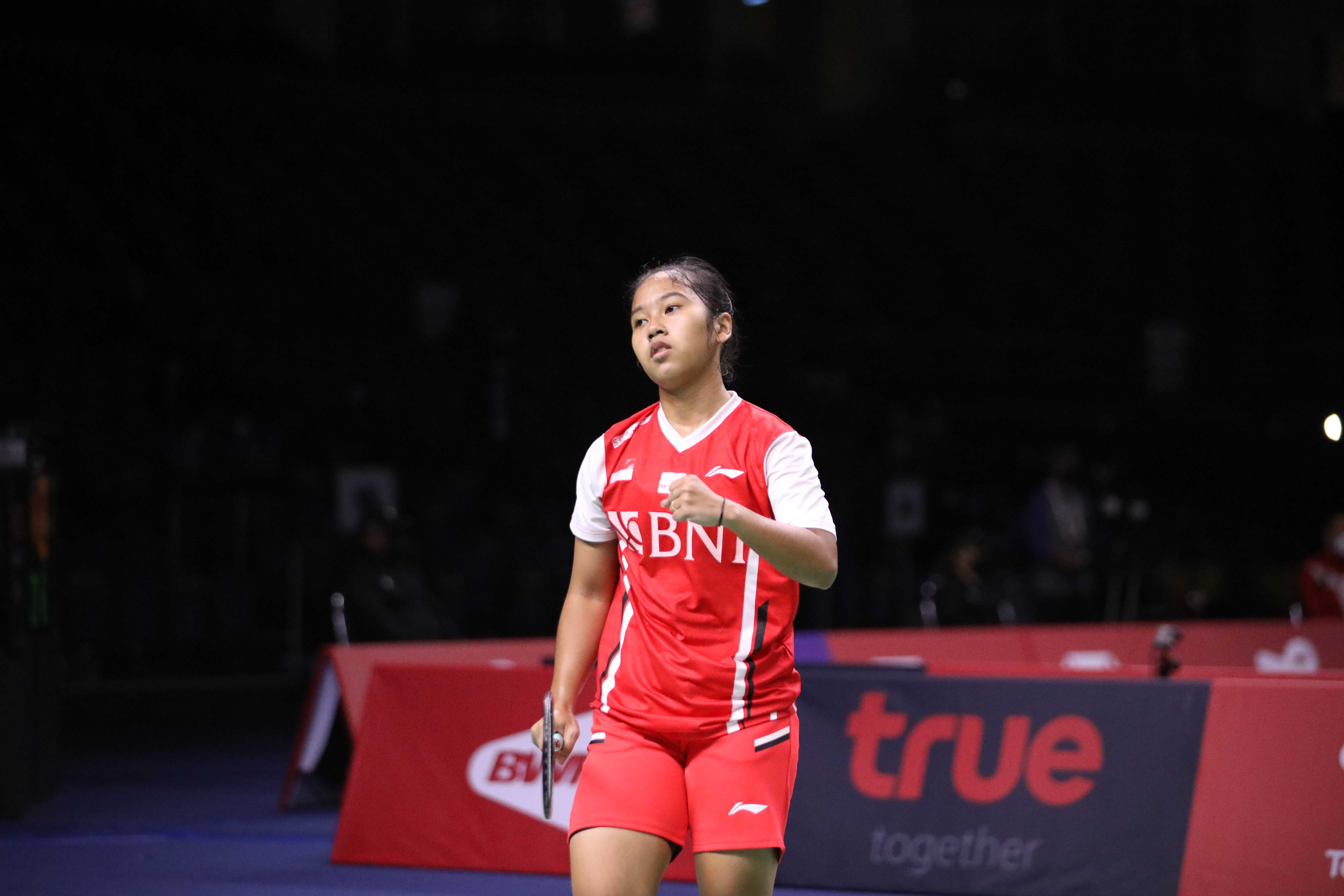 Pemain tunggal putri Indonesia, Aisyah Sativa Fatetani saat melawan tunggal putri Perancis, Léonice Huet pada laga pembuka perebutan Piala Uber 2022 di Impact Arena, Bangkok, Minggu (8/5). ,(HO:Humas PP PBSI/sportsmoment.id)