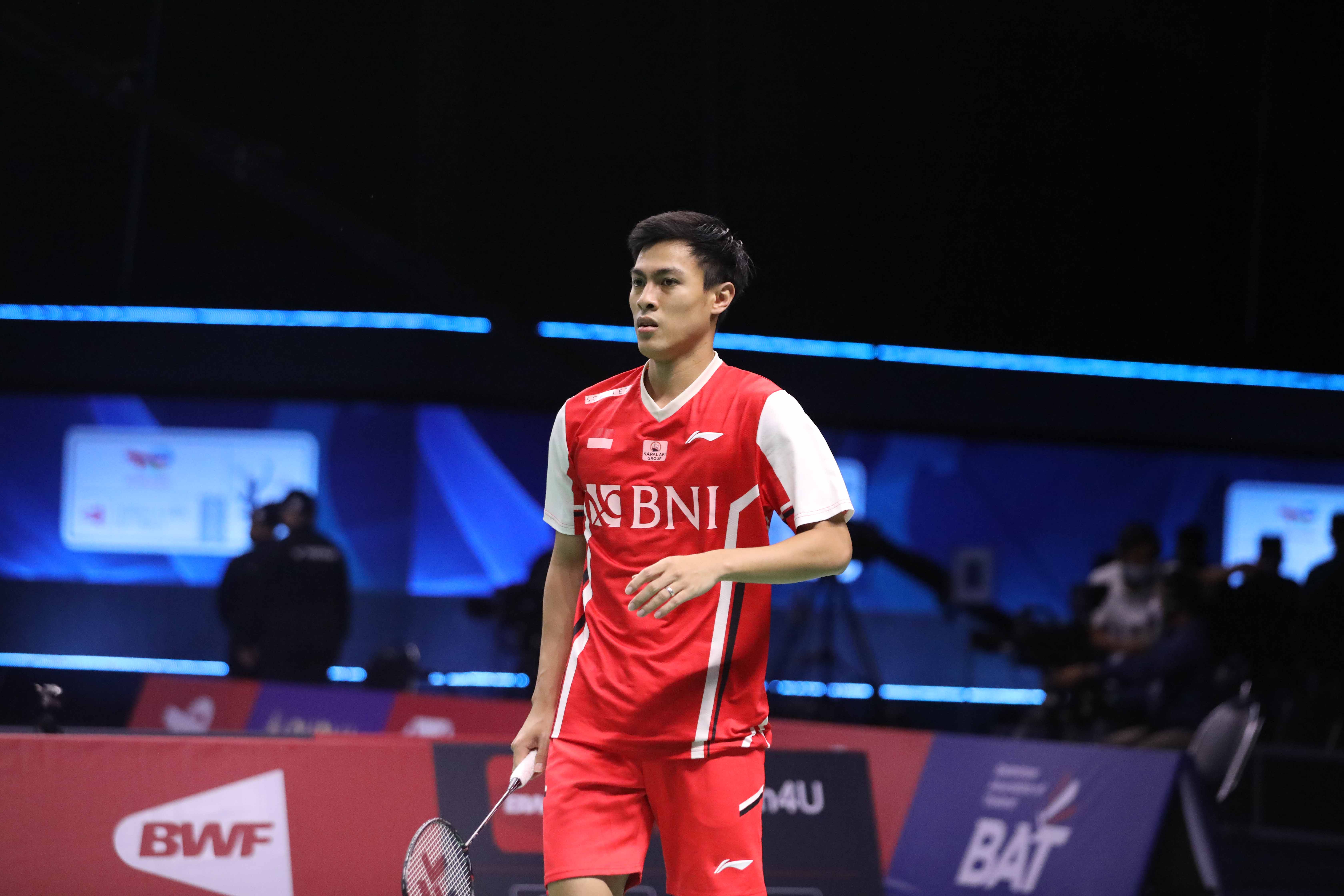 Pemain tunggal putra Indonesia, Shesar Hiren Rhustavito saat melawan pemain tunggal putra Singapura, Jia Wei Joel Koh pada babak penyisihan Grup A perebutan Piala Thomas 2022 di Impact Arena, Bangkok, Minggu (8/5).,(HO:Humas PP PBSI/sportsmoment.id),