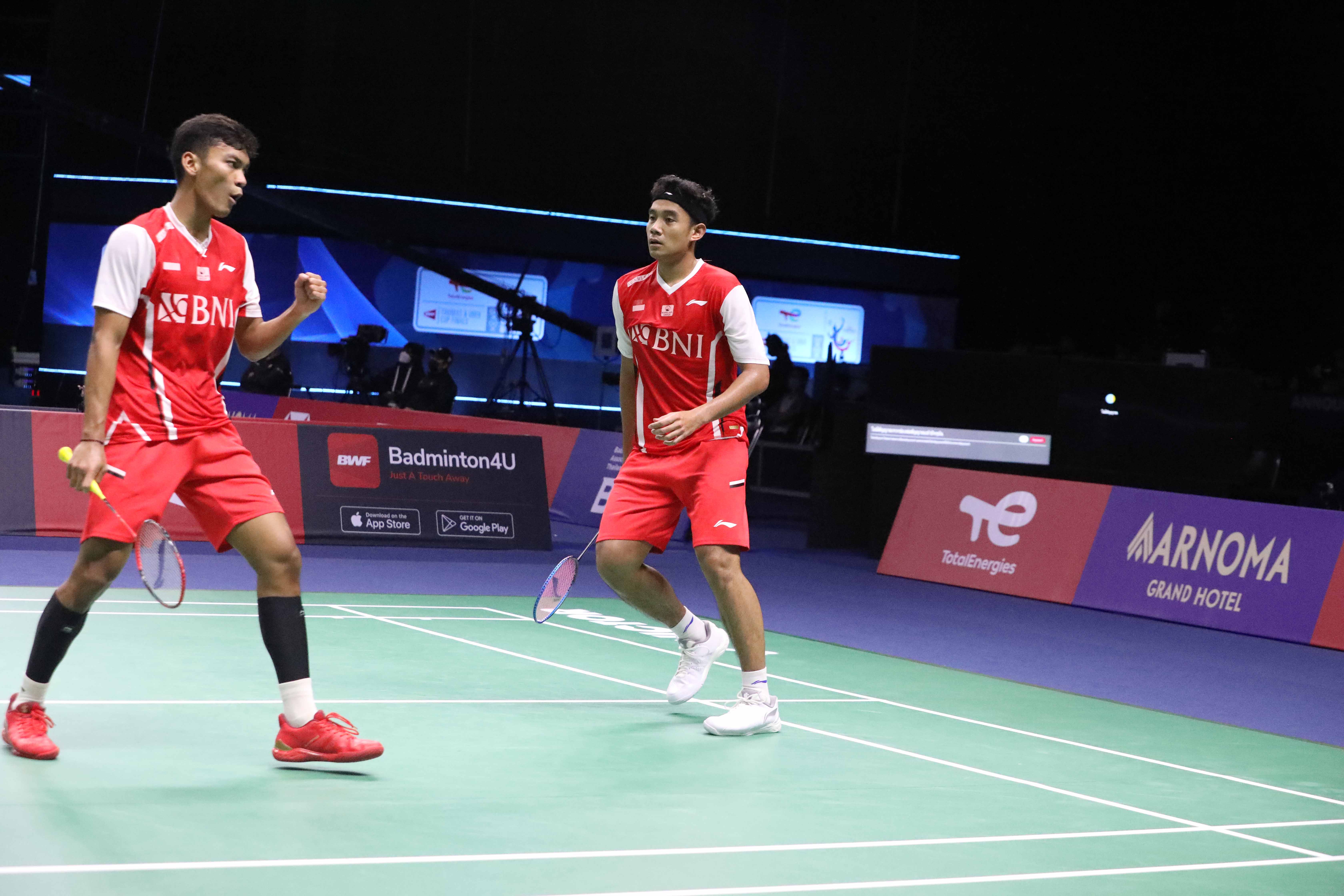Pasangan ganda putra Indonesia, Bagas Maulana/Muhammad Shohibul Fikri saat melawan pasangan ganda putra Singapura, Danny Bawa Chrisnanta/Jun Liang Andy Kwek pada babak penyisihan Grup A perebutan Piala Thomas 2022 di Impact Arena, Bangkok, Minggu (8/5)., (HO:Humas PP PBSI/sportsmoment.id)
