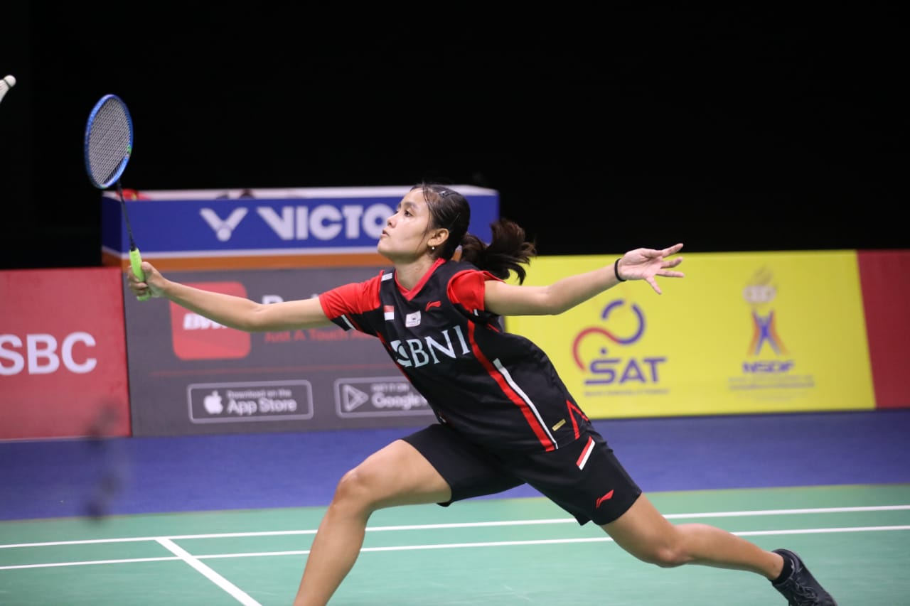 Pemain tunggal putri Indonesia, Bilqis Prasista harus mengakui keunggulan tunggal putri Tiongkok, He Bing Jiao pada babak perempatfinal perebutan Piala Uber 2022 di Impact Arena, Bangkok, Kamis (12/5). Indonesia kalah 0-3 dari Tiongkok. (HO : Humas PP PBSI/sportsmoment.id),