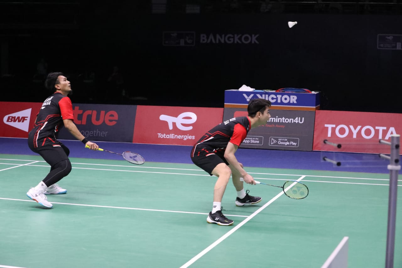 Pasangan ganda putra Indonesia, Mohammad Ahsan/Kevin Sanjaya Sukamuljo berhasil mengalahkan ganda putra Tiongkok, Liu Yu Chen/Ou Xuan Yi pada babak perempatfinal perebutan Piala Thomas 2022 di Impact Arena, Bangkok, Kamis (12/5). Indonesia menang 3-0 atas Tiongkok dan pastikan satu tempat dibabak semifinal. (HO : Humas PP PBSI/sportsmoment.id)