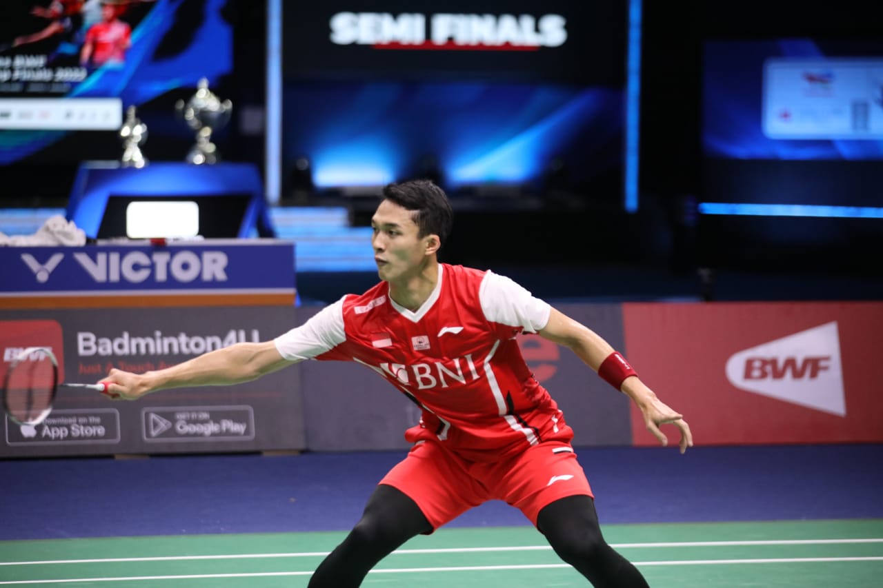 Pemain tunggal putra Indonesia, Jonatan Christie harus mengakui keunggulan pemain tunggal putra Jepang, Kenta Nishimoto pada babak semifinal perebutan Piala Thomas 2022 di Impact Arena, Bangkok, Jum'at (13/5). Jepang memperkecil ketertinggalan menjadi 1-2 atas Indonesia. (HO : Humas PP PBSI/sportsmoment.id)