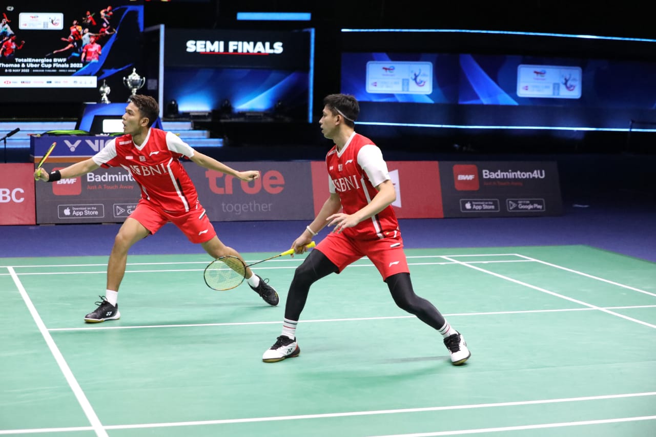 Pasangan ganda putra Indonesia, Fajar Alfian/Muhammad Rian Ardianto harus mengakui keunggulan ganda putra Jepang, Akira Koga/Yuta Watanabe pada babak semifinal perebutan Piala Thomas 2022 di Impact Arena, Bangkok, Jum'at (13/5). Jepang berhasil menyamakan kedudukan menjadi 2-2 atas Indonesia. (HO : Humas PP PBSI/sportsmoment.id)