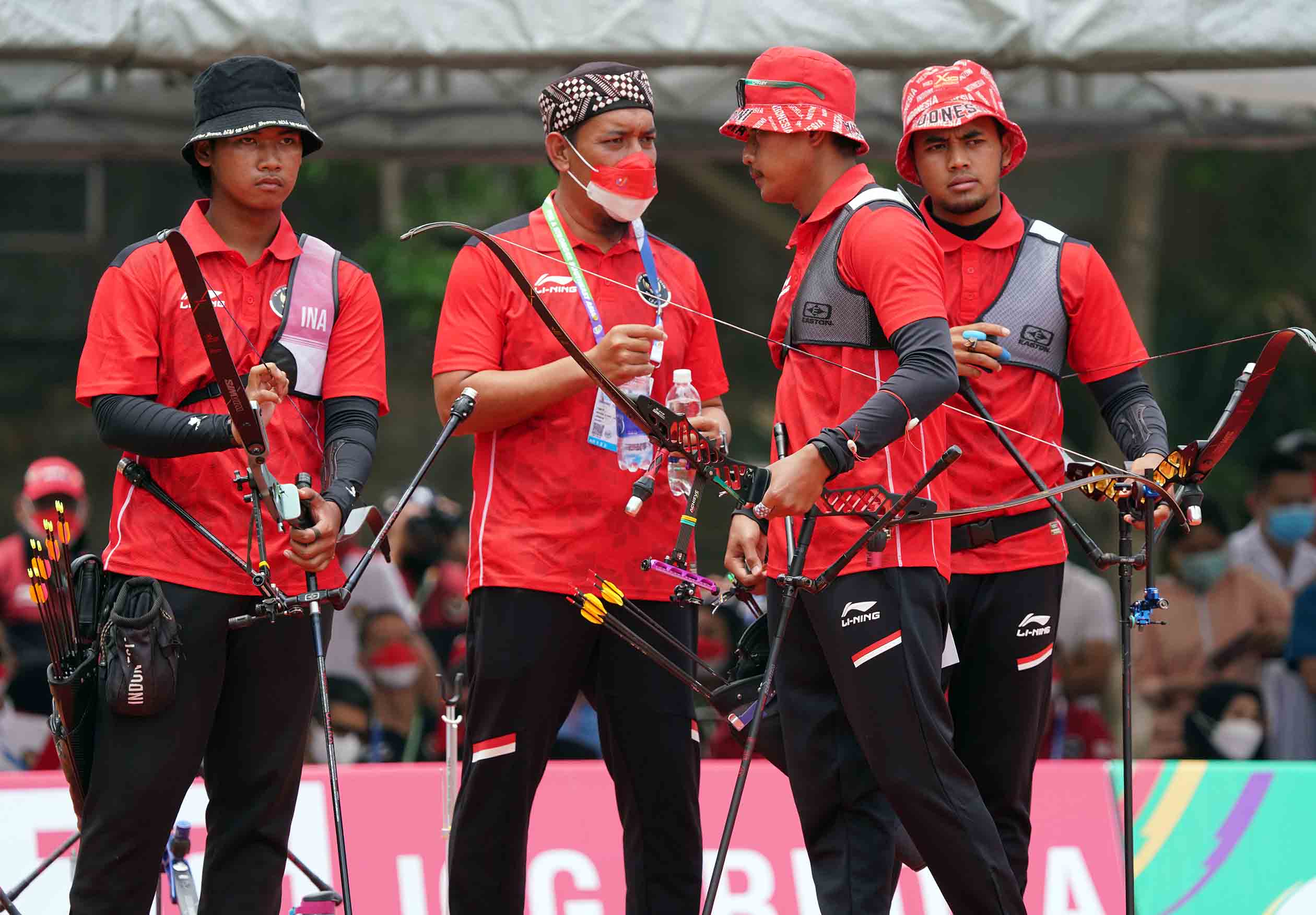 Tim panahan yang terdiri atas Riau Ega Agatha Salsabila, Arif Dwi Pangestu, dan Bagas Alvyanto Prastyadi merebut emas cabang panahan nomor recurve beregu putra Sea Games 2021 di Vietnam. Pada pertandingan yang berlangsung di Hanoi Sports Training and Competition Center, Rabu, 18 Mei 2022, Riau Ega dan rekannya berhasil mengalahkan tim tuan rumah Vietnam. (Photo : HO/Kemenpora/PP SIWO PWI/Erly Bahtiar/Sportsmoment.id)
