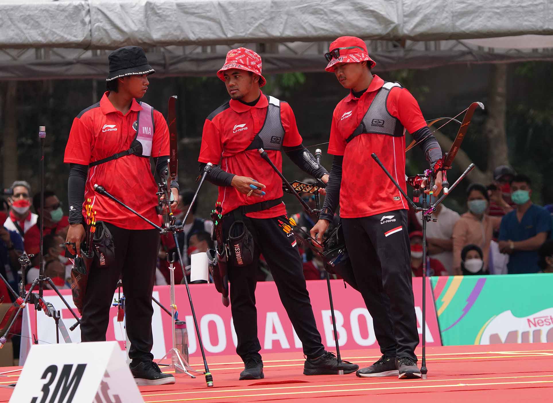 Tim panahan yang terdiri atas Riau Ega Agatha Salsabila, Arif Dwi Pangestu, dan Bagas Alvyanto Prastyadi merebut emas cabang panahan nomor recurve beregu putra Sea Games 2021 di Vietnam. Pada pertandingan yang berlangsung di Hanoi Sports Training and Competition Center, Rabu, 18 Mei 2022, Riau Ega dan rekannya berhasil mengalahkan tim tuan rumah Vietnam. (Photo : HO/Kemenpora/PP SIWO PWI/Erly Bahtiar/sportsmoment.id)