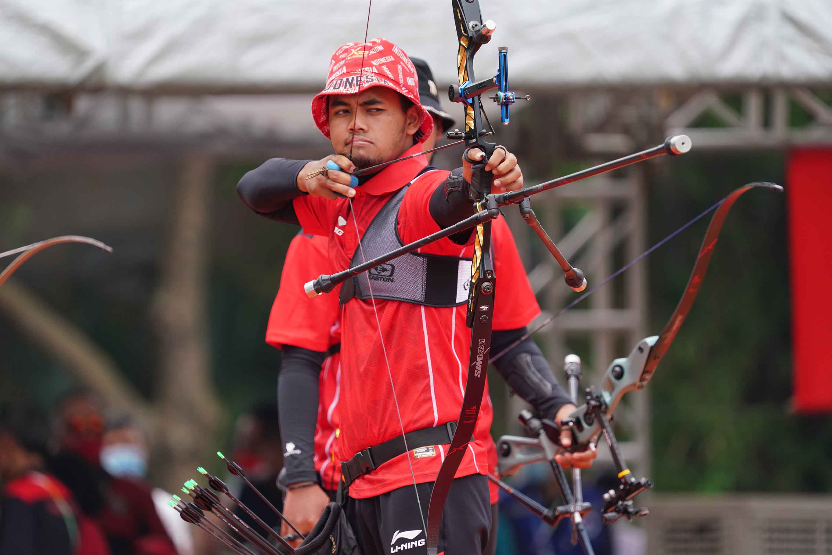 Pemanah Indonesia, Bagas Alvyanto Prastyadi membidik panah ke arah sasaran pada nomor recurve beregu putra Sea Games 2021 di Vietnam. Arif bersama Riau Ega Agatha Salsabila, dan Arif Dwi Pangestu berhasil merebut emas cabang panahan . Pada pertandingan yang berlangsung di Hanoi Sports Training and Competition Center, Rabu, 18 Mei 2022, Riau Ega dan rekannya berhasil mengalahkan tim tuan rumah Vietnam. (Photo : HO/Kemenpora/PP SIWO PWI/Erly Bahtiar/sportsmoment.id)