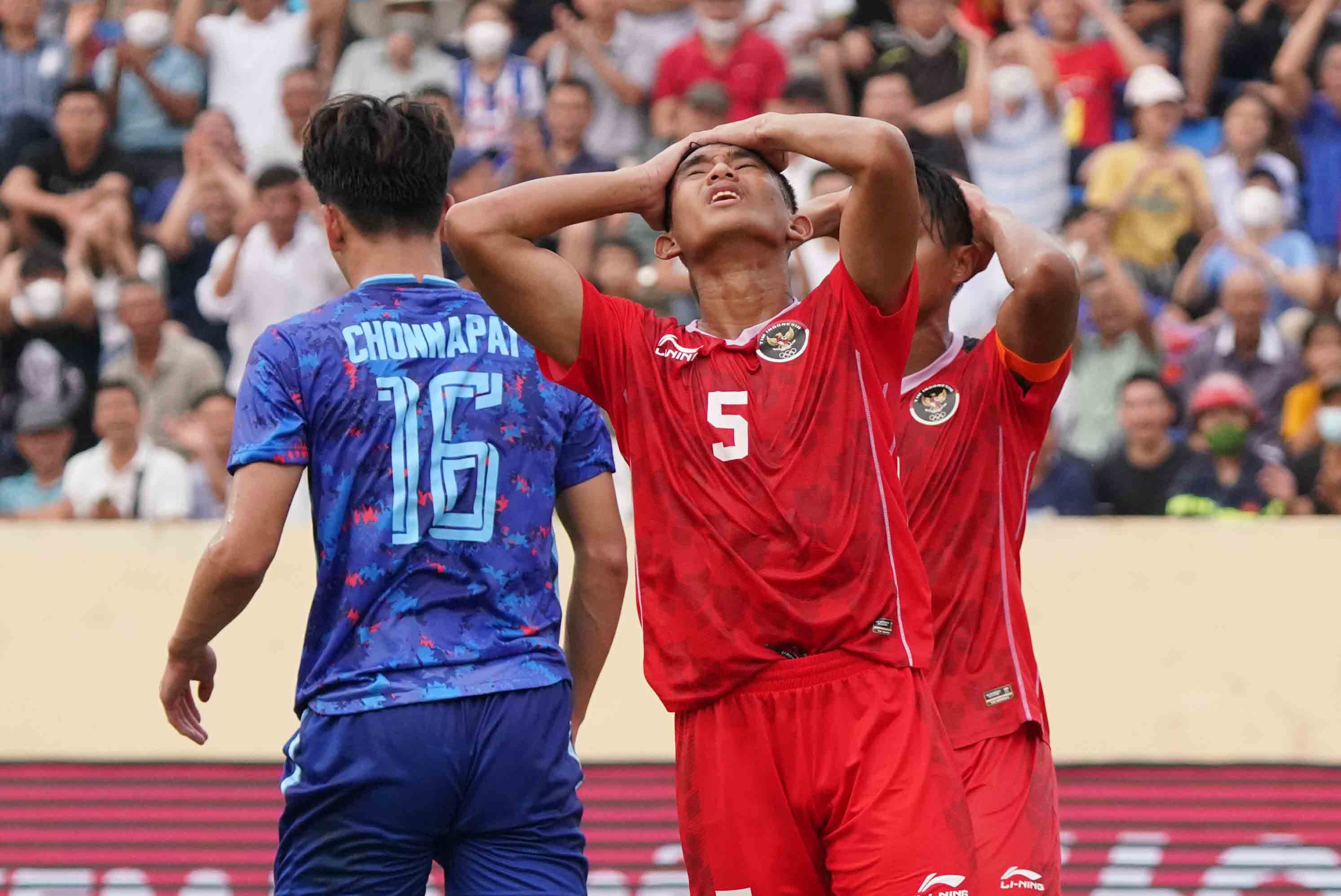 Rizky Ridho Ramadhani (5) menyesal setelah timnas Indonesia U-23 gagal ke final SEA Games 2021 usai kalah 0-1 dari Thailand U-23 pada semifinal cabang olahraga sepakbola di stadion Thien Truong, Nam Dinh, Vietnam, Kamis, 19 Mei 2022 (Photo : HO/Kemenpora/PP SIWO PWI/Erly Bahtiar/sportsmoment.id)