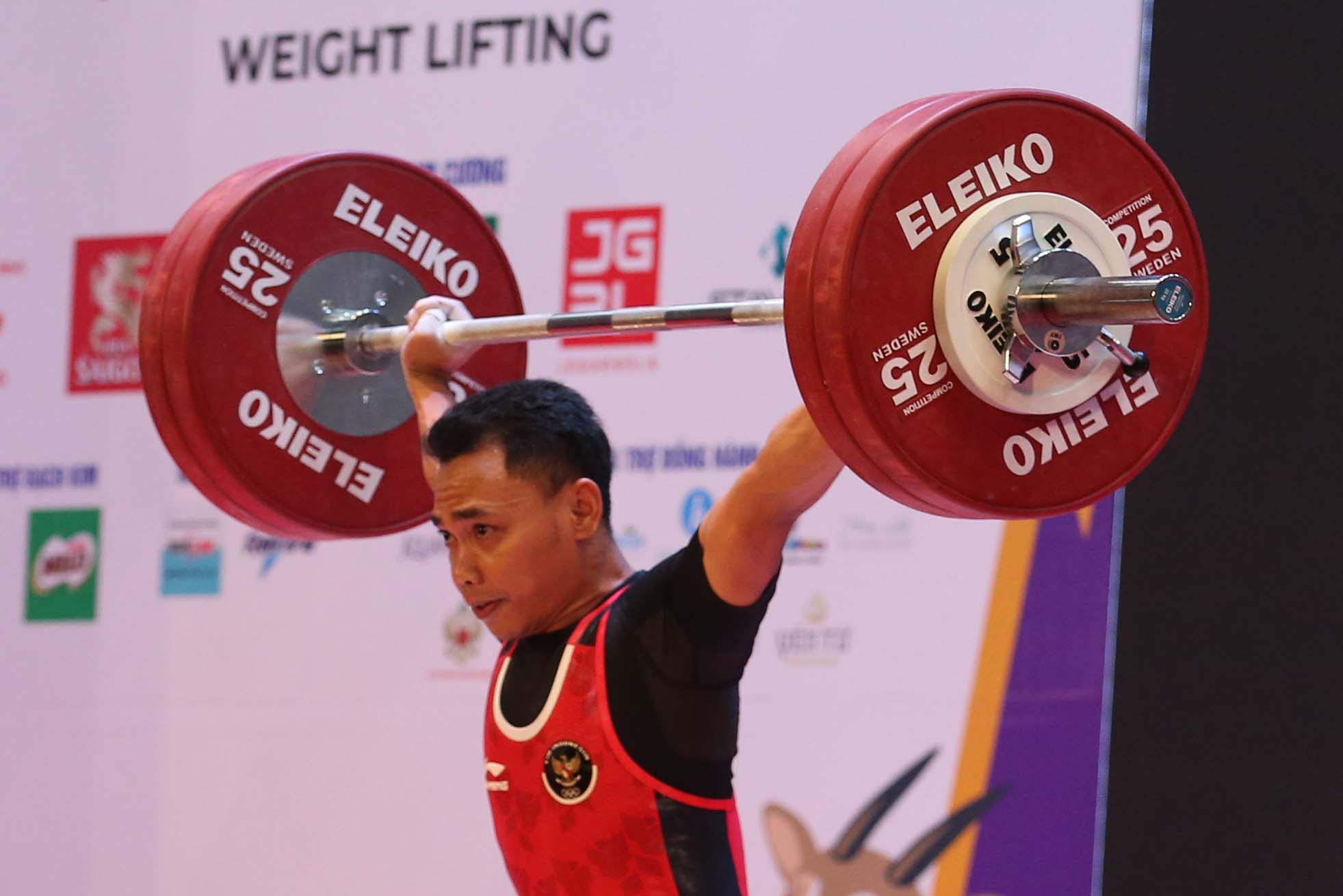 Lifter Indonesia Eko Yuli Irawan berhasil meraih medali emas pada final angkat besi nomor 61 kg putra angkatan clean and jerk pada SEA Games 2021 Vietnam di Hanoi Sports Training and Competition Center, Hanoi, Vietnam, Jumat 20 Mei 2022 (Photo : HO/Kemenpora/PP SIWO PWI/Erly Bahtiar/sportsmoment.id)